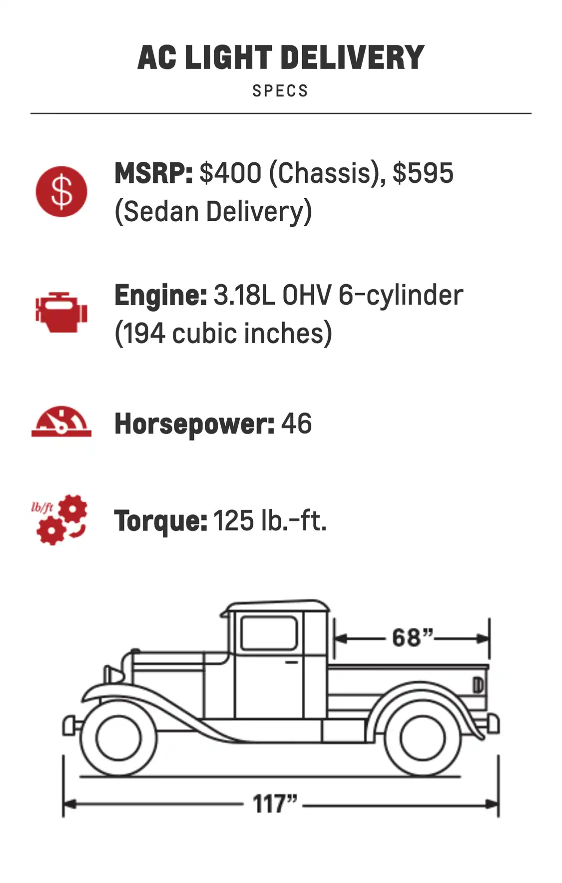 The truck was meant to be an affordable and flexible platform for customers to build on and could be purchased as either a cowl and chassis or an express body. With a suggested retail price of $1,325, this 36-hp, four-cylinder pickup was affordable for the average household income.