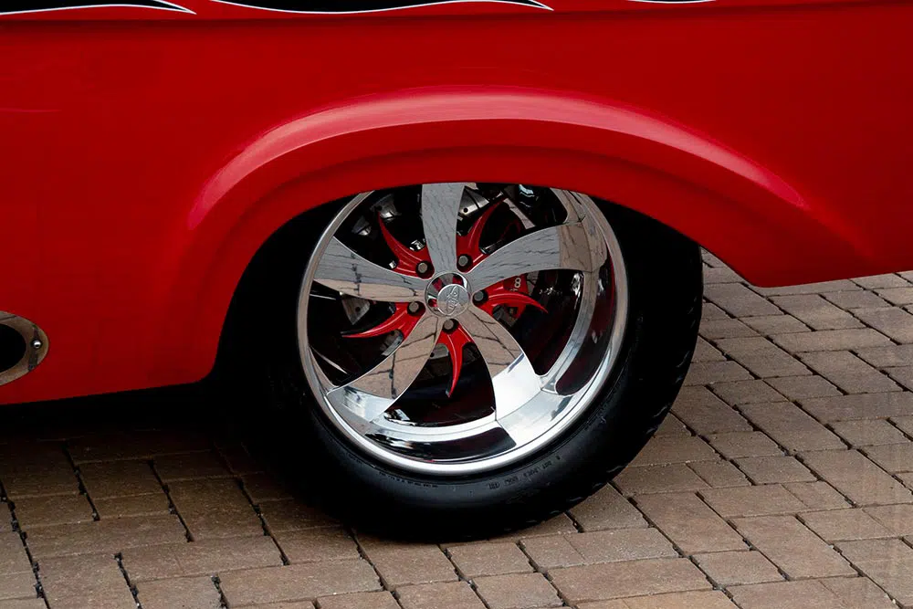 The transformation began by Eddie’s ditching of the old frame in favor of a 1968 Ford F-100 frame, adding Viking coilovers up front and QA1 coilovers at the rear, and modifying the rear for a custom Moser axle setup. A Flaming River column and Mustang II front suspension greatly improved steering, which would make driving the Ford a lot easier. Once the frame was finished, it was stripped and painted red, while the components attached to the frame were either painted red or chromed. A set of Intro Dangerous wheels in 19- and 20-inch diameters perfected the chassis.