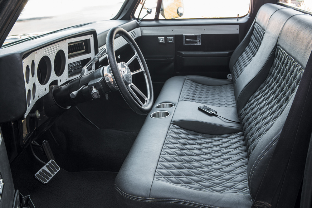 Finally, with a focus on interior comfort, Josh ordered up a black leather Snowden Customs bench seat with double diamond stitching. A new seat along with Dakota Digital VHX gauges, a Forever Sharp billet steering wheel and an Alpine audio system gave helped the inside look and feel and custom as the outside.