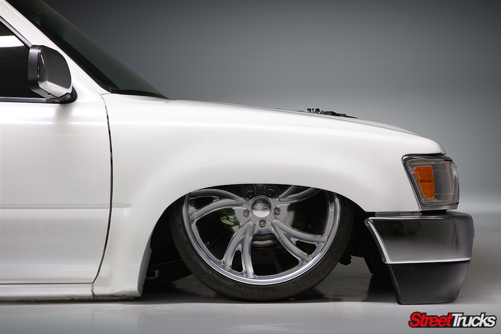 Throughout the truck’s lifetime, it underwent a series of upgrades and mods by Chad and its previous owners. While under Chad’s care, however, it became the slammed stunner you see before you. He had a goal—debut this Hilux at SEMA—and he gave himself one year to do it. He knew it wasn’t going to be easy.