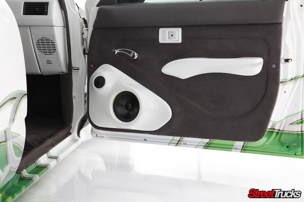 The hand-built interior made this truck special, too. It had stock instruments and gauges and an Alpine stereo, but it had custom everything else, thanks to Joel Sadenwasser at Extreme Audio and Kustoms in central California. He reupholstered the seats and crafted a handmade fiberglass center console and speaker pods. Chad also had Bill Flynn at DFM Car Audio in Ukiah, California, create a custom rear sub enclosure with JL Audio components.