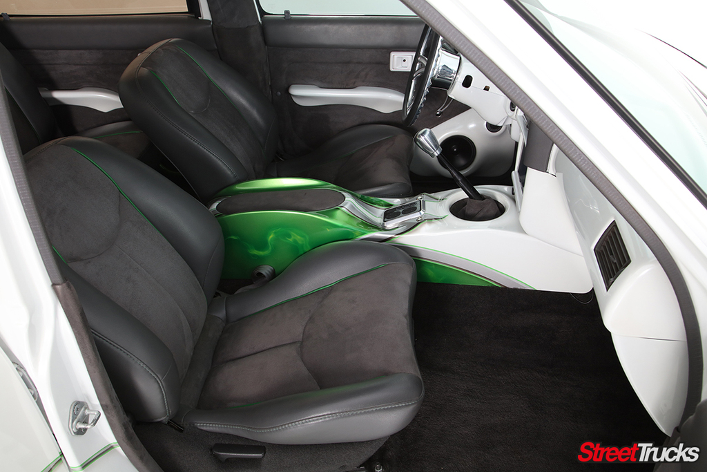For the exterior mods, Chad added a grille and bumpers from a Toyota 4Runner and rebuilt fenders with flares from Grant Fabrication and Welding. It’s painted an almost iridescent Lexus Pearl White with Spirited Green PPG graphics, both of which were expertly applied by Matt Hutchinson from Riverside, California.