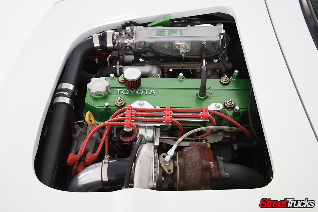 Under the hood, a 1992 Toyota 4-cylinder 22RE engine made this truck go, and it was built, balanced and blueprinted by LC Engineering out of Lake Havasu, Arizona. The crew there added a stage three turbo setup along with a full standalone Haltech computer and wire harnesses. Chad controlled the truck’s go via its stock 1992 transmission and Wilwood brakes front and back.