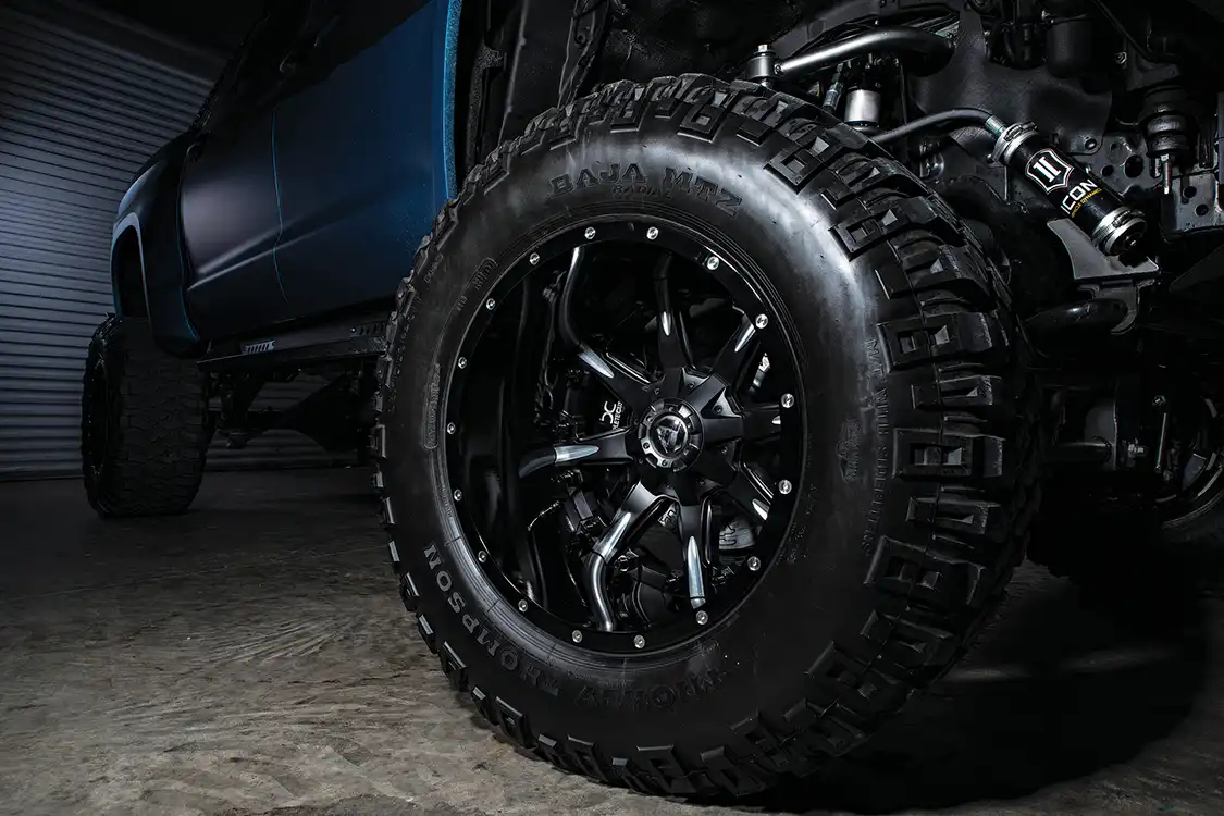 The Complete Customs crew is responsible for guiding this build through to the finish, and they went to town on a custom Bulletproof 12-inch lift in the front and an Atlas 10-inch lift in the rear. The rear track bars and front spindles also come from Bulletproof Suspension, while Icon Vehicle Dynamics shocks help keep the Fuel Off-Road wheels and 38-inch Mickey Thompson Baja MTZ tires on the ground at all four corners. Providing the truck with substantial stopping power are discs from R1 Concepts.
