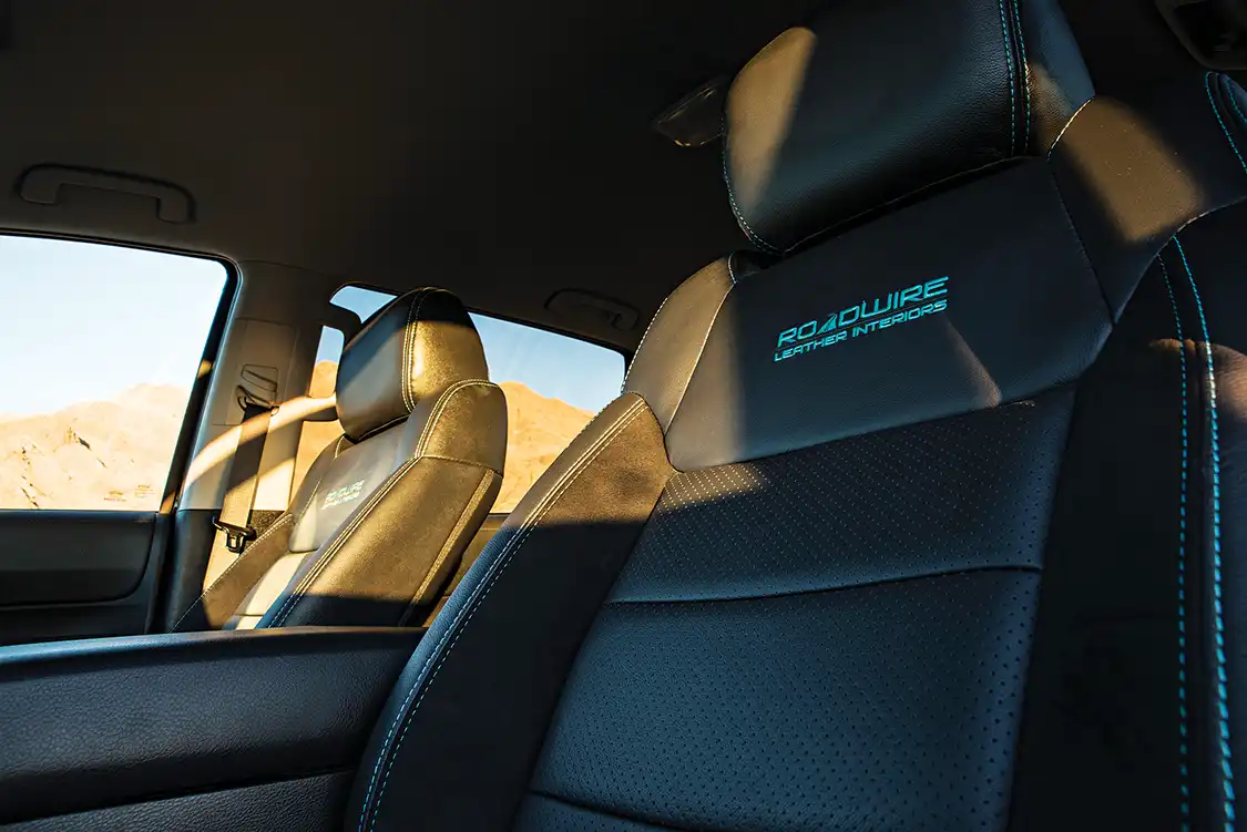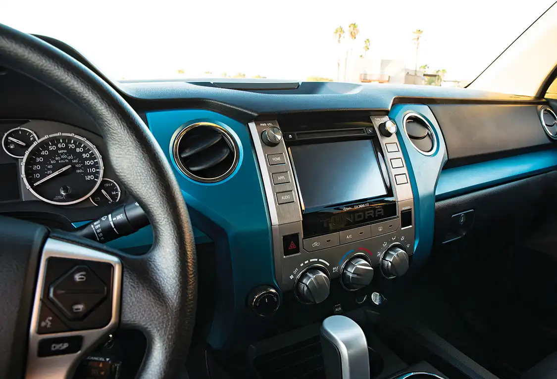 With the exterior color choice made, the interior of the truck was designed to match by Roadwire Leather Interiors. Black leather seats with suede bolsters and perforated inserts give passengers a comfortable, body-hugging place to sit, while the custom Matte Lagoon Blue Metallic- wrapped dash and seat embroidery match the truck’s exterior perfectly. Of course, we can’t forget about the sPod switch panel tucked neatly where the sunglass holder used to be, which gives Keena access to all of the necessary switches while maintaining the sleek modern interior.