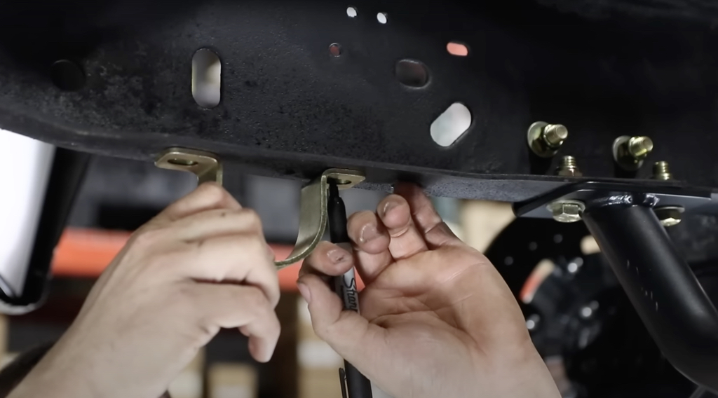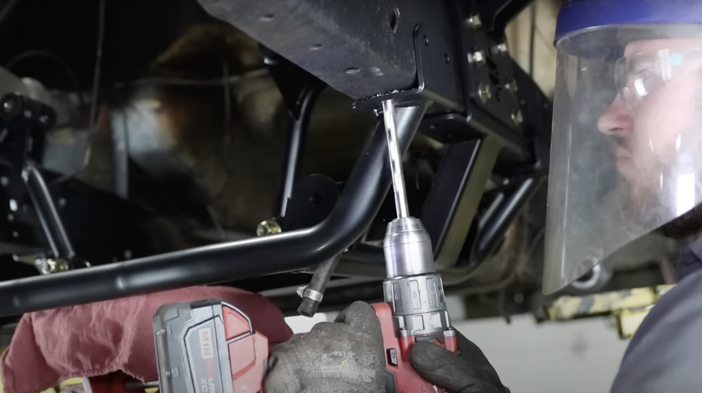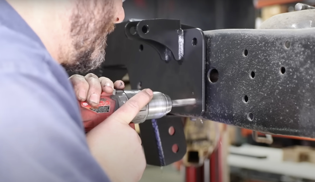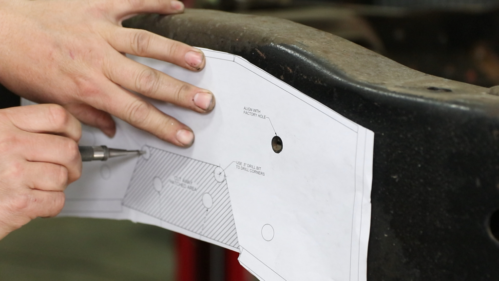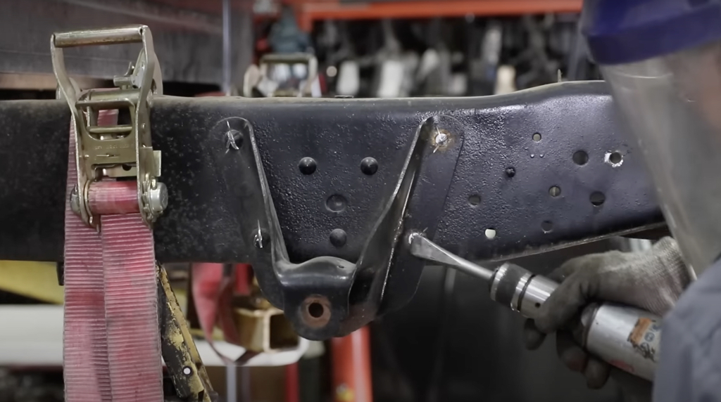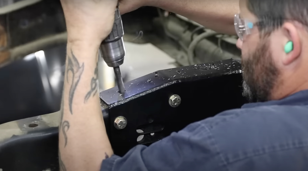 With the frame notched, cleaned, and puff-can painted, we placed the new bracket in the frame and drilled out the mounting holes.