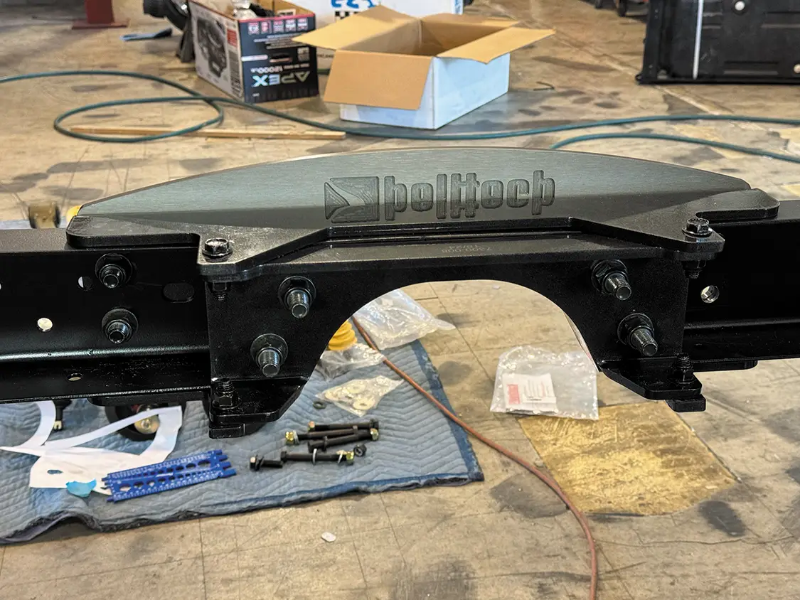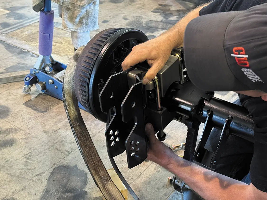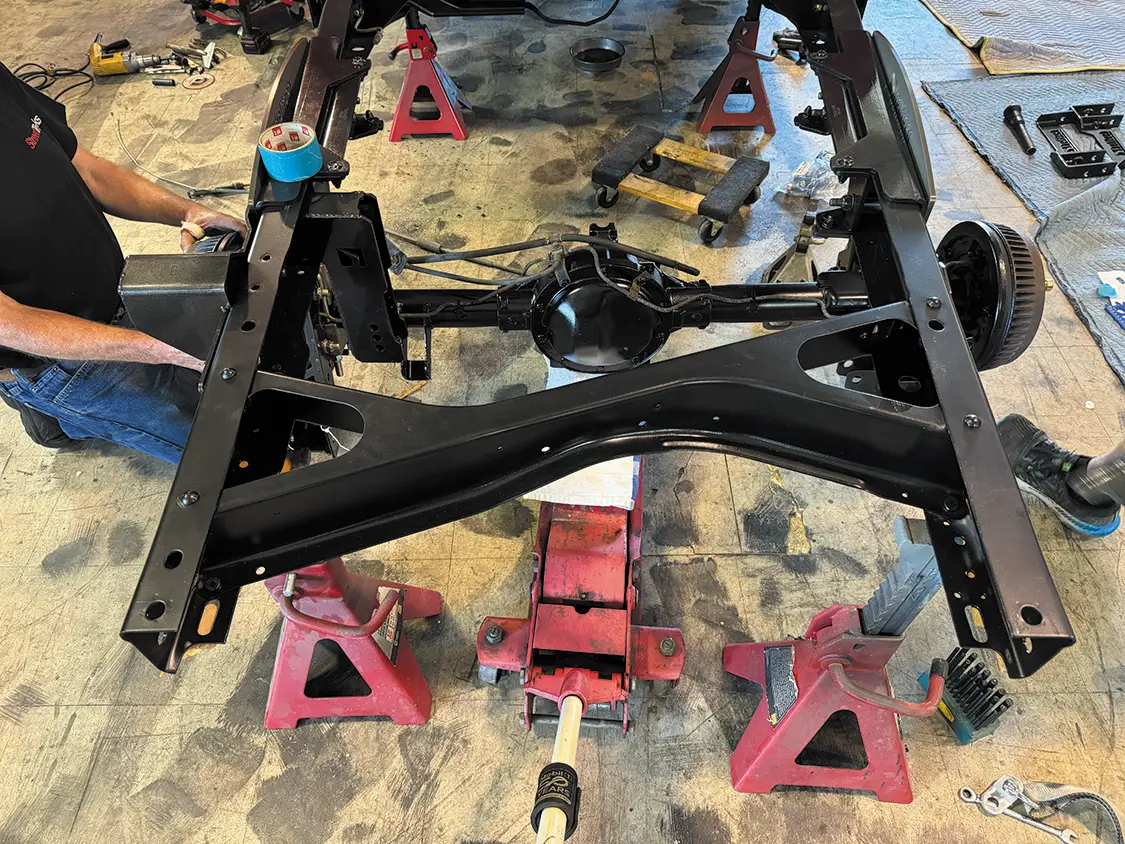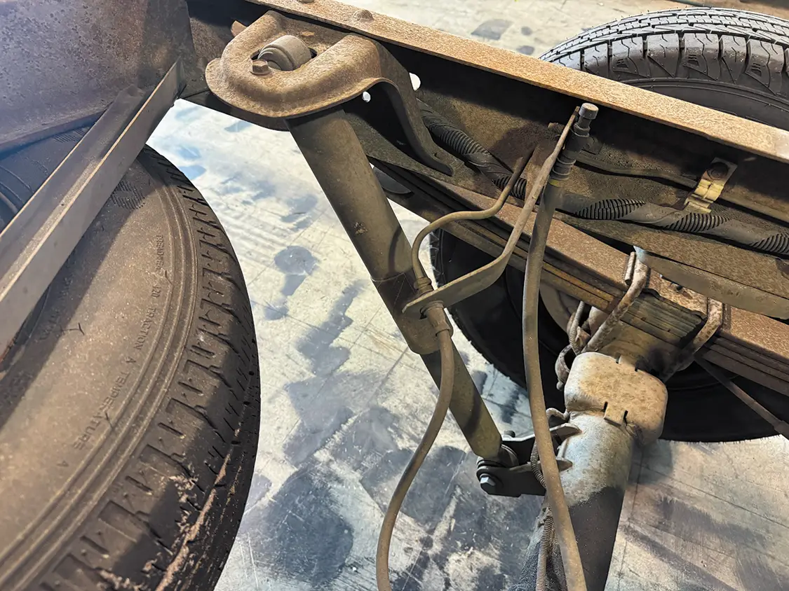 With everything in place, we tightened all the bolts and slid the axle back under the truck frame.