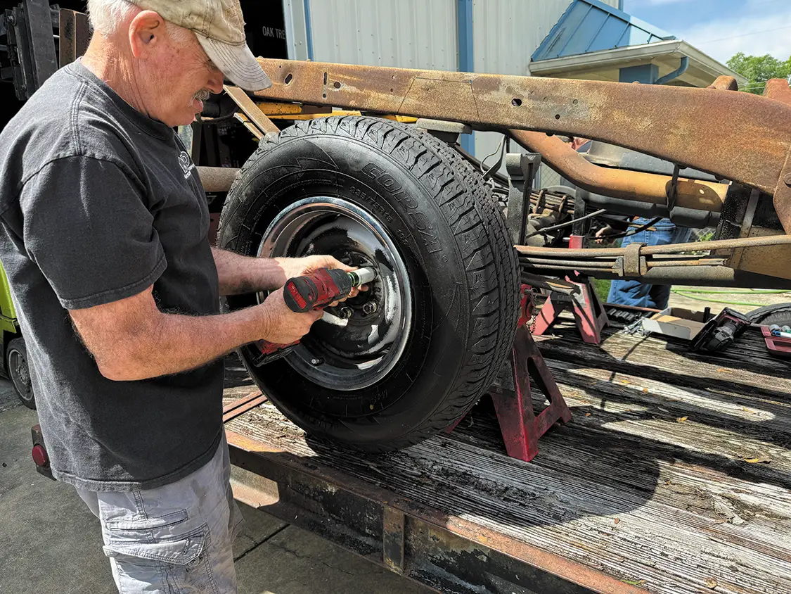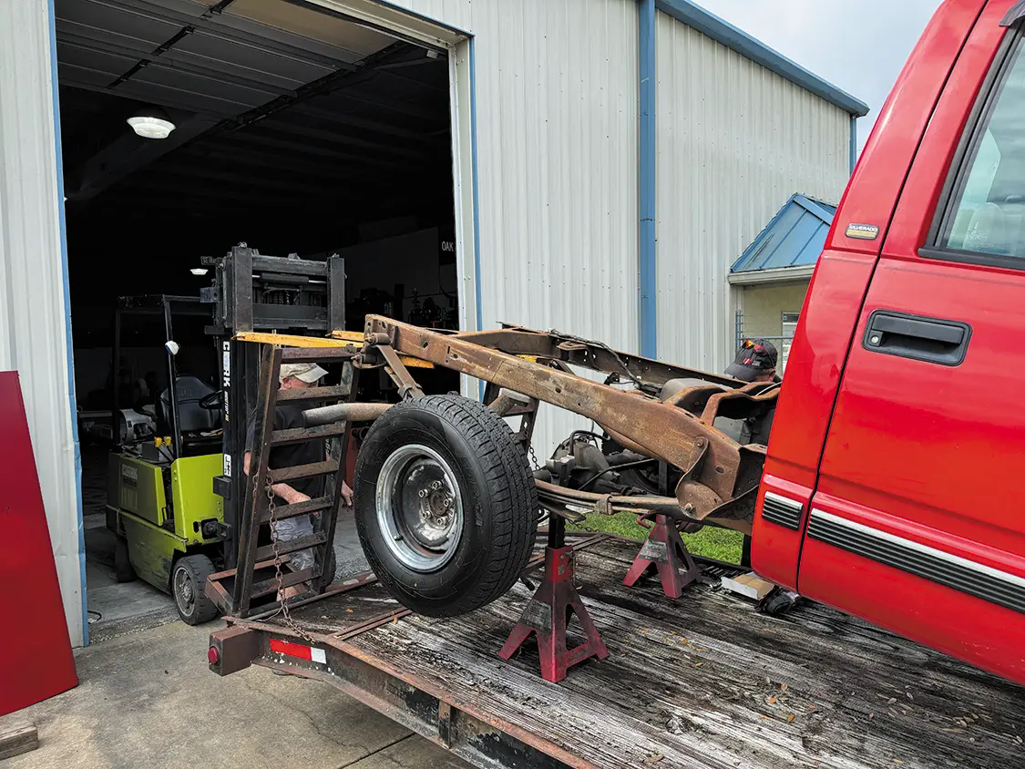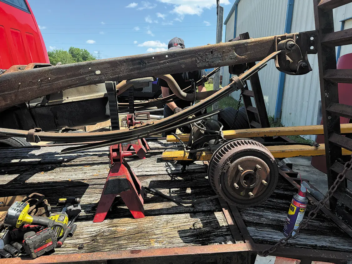 Before removing the rear axle, we drove it outside and put it on the trailer. This way we can remove the leaf springs and axle before bringing the truck over to the sandblaster.With the truck on jack stands, we could hack these 15-inch wheels off. Can’t wait to bolt up our new Billet Specialties wheels!The forklift came in handy again by sliding out the rear axle. We will sandblast and paint this as well.