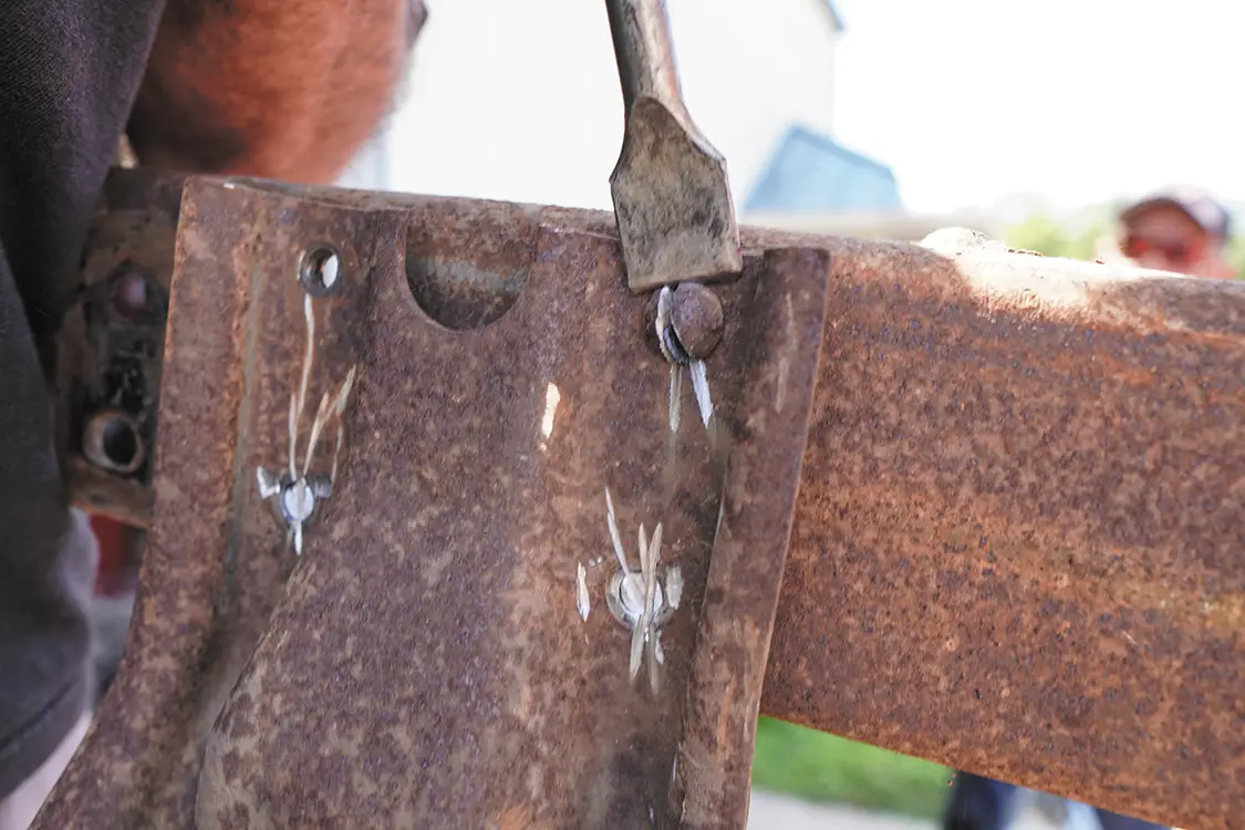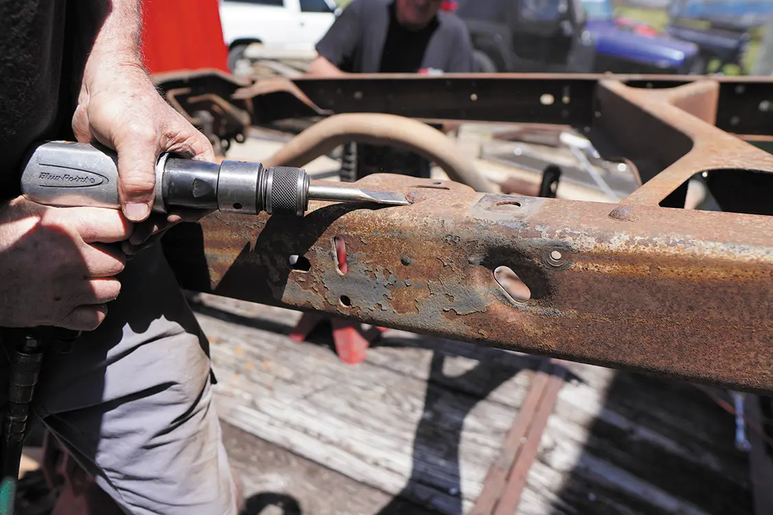 The rear leaf spring hangers could come off now. We used a cutting wheel to make relief cuts in the rivets, then a pneumatic chisel to remove the rivet heads.