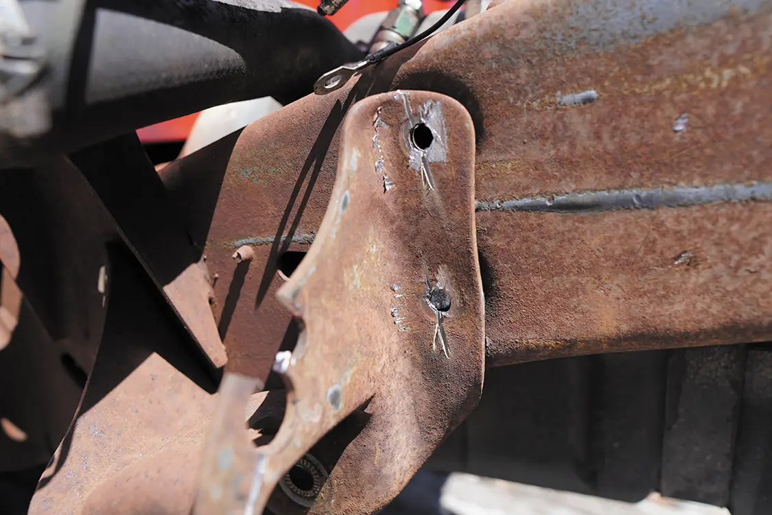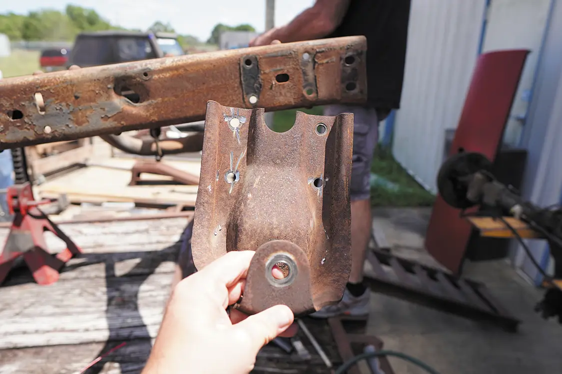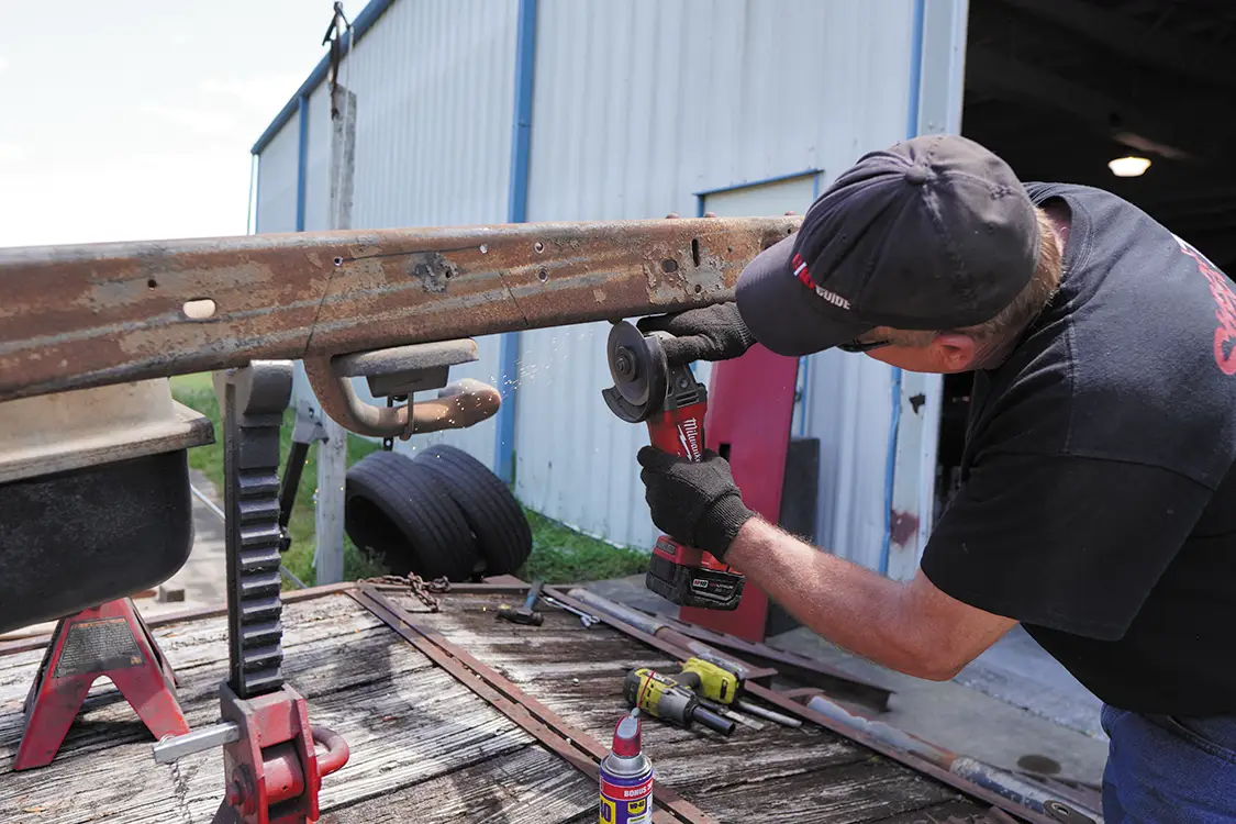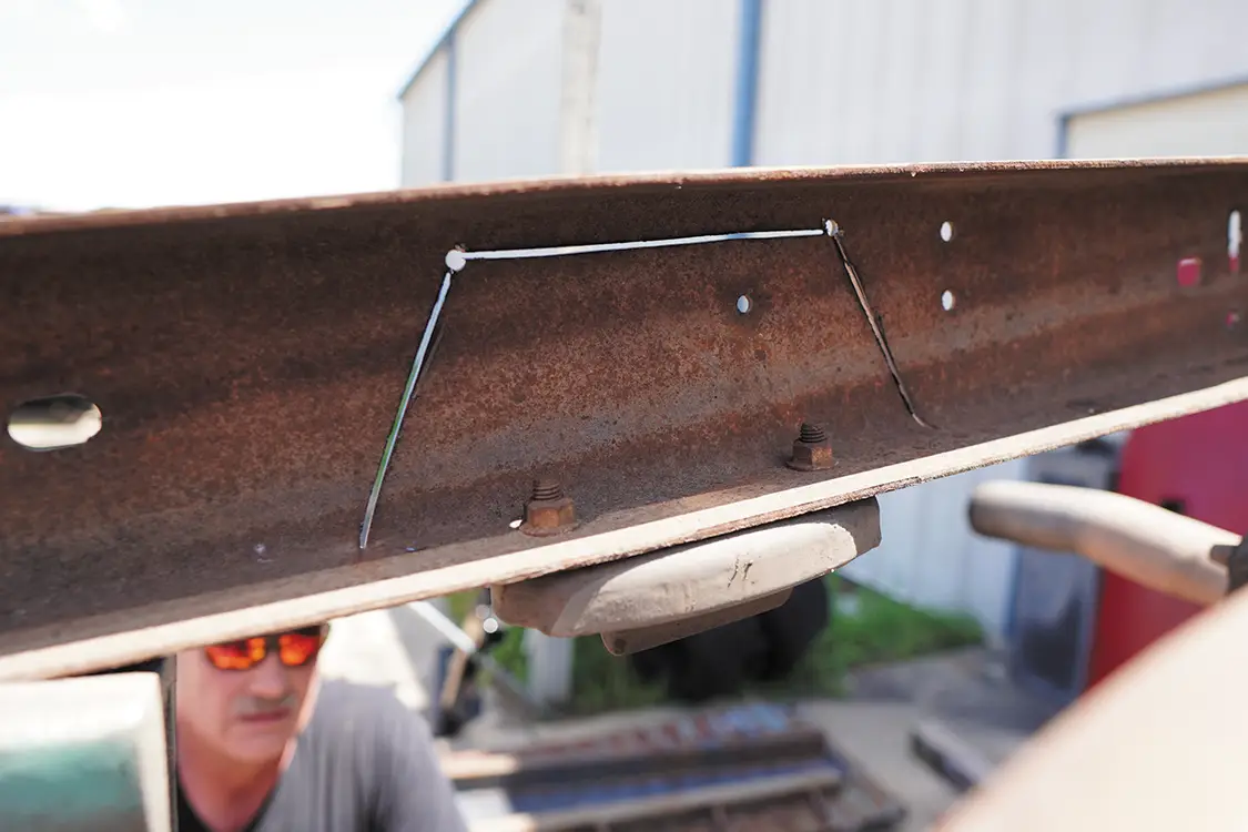 We went ahead and made a slice in the frame where the C-notch brackets go, but we didn’t cut them out all the way to maintain structure, as we towed it to the sandblaster.