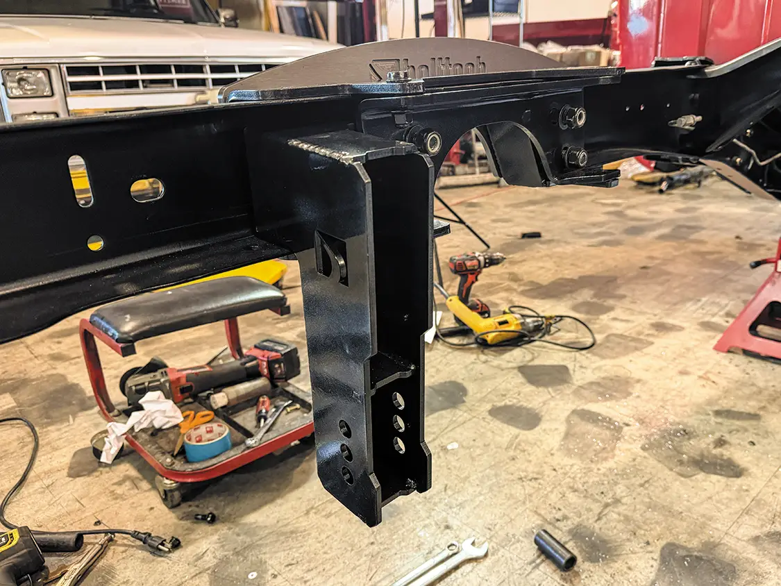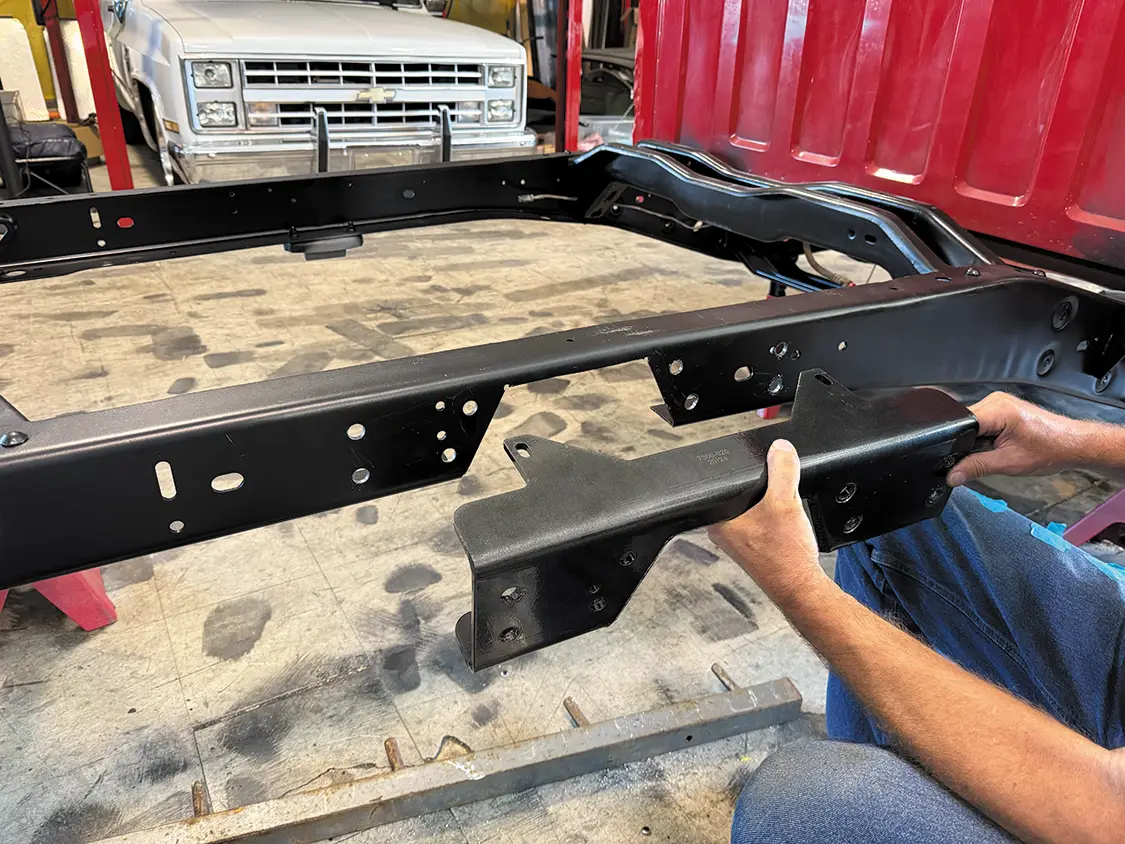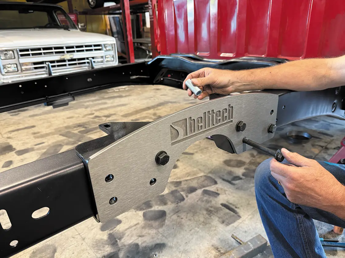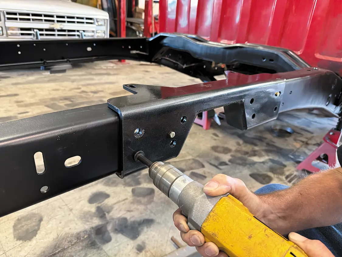 The sandblaster protected the cab of the truck and ripped all the rust and paint off the frame with ease.After sandblasting and painting, the truck is back at the shop looking great.Check out the finish of our nearly 30-year-old frame now; it looks like new!Roger could now finish cutting out the rest of the C-notch with the back of the frame supported.We then slipped in the C-notch bracket from Belltech and marked the holes to be drilled.That was followed by drilling the holes in the frame for the provided hardware.This kit includes this sweet-looking metal panel for the front of the C-notch with the Belltech logo cut into it.For additional support, Belltech designed this inner C-notch bracket that attaches using the provided hardware.Here’s a look from the inside. Extra beefy and built to support a ton of abuse.With the passenger side complete, we could head over to the driver’s side and repeat the process.