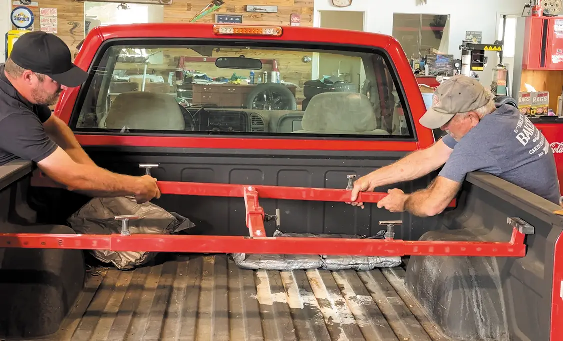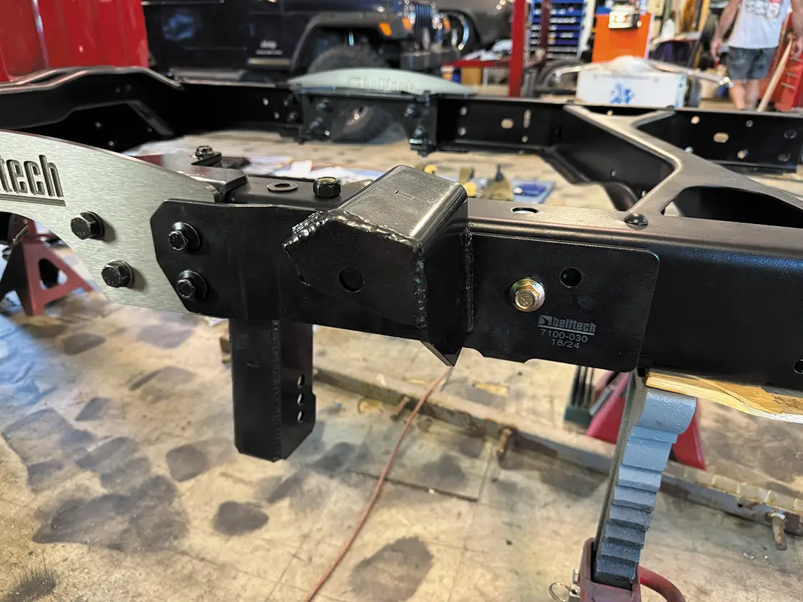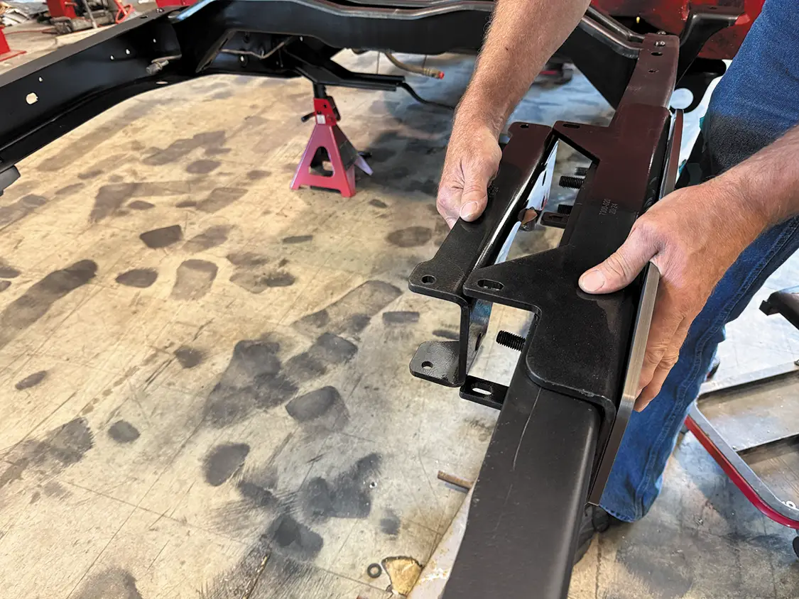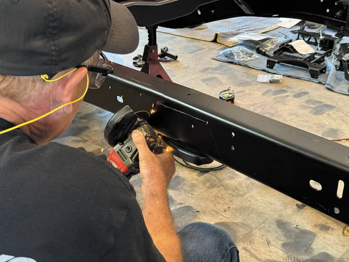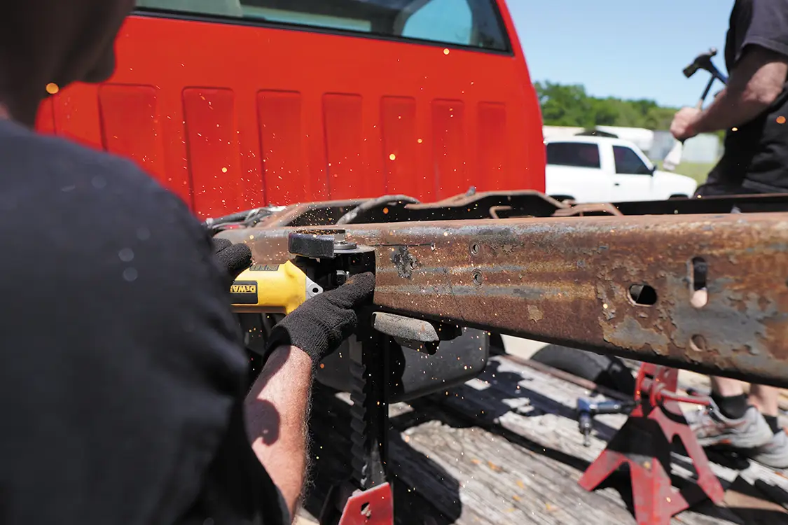 The sandblaster protected the cab of the truck and ripped all the rust and paint off the frame with ease.After sandblasting and painting, the truck is back at the shop looking great.Check out the finish of our nearly 30-year-old frame now; it looks like new!Roger could now finish cutting out the rest of the C-notch with the back of the frame supported.We then slipped in the C-notch bracket from Belltech and marked the holes to be drilled.That was followed by drilling the holes in the frame for the provided hardware.This kit includes this sweet-looking metal panel for the front of the C-notch with the Belltech logo cut into it.For additional support, Belltech designed this inner C-notch bracket that attaches using the provided hardware.Here’s a look from the inside. Extra beefy and built to support a ton of abuse.With the passenger side complete, we could head over to the driver’s side and repeat the process.