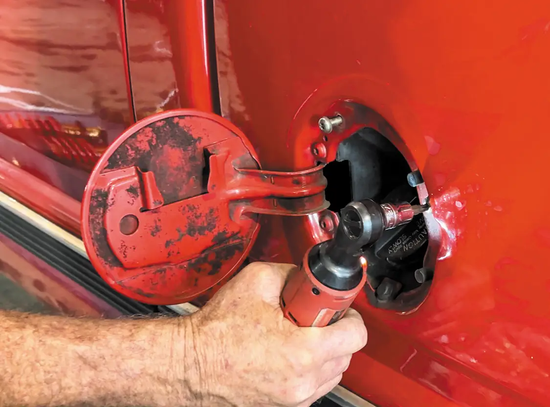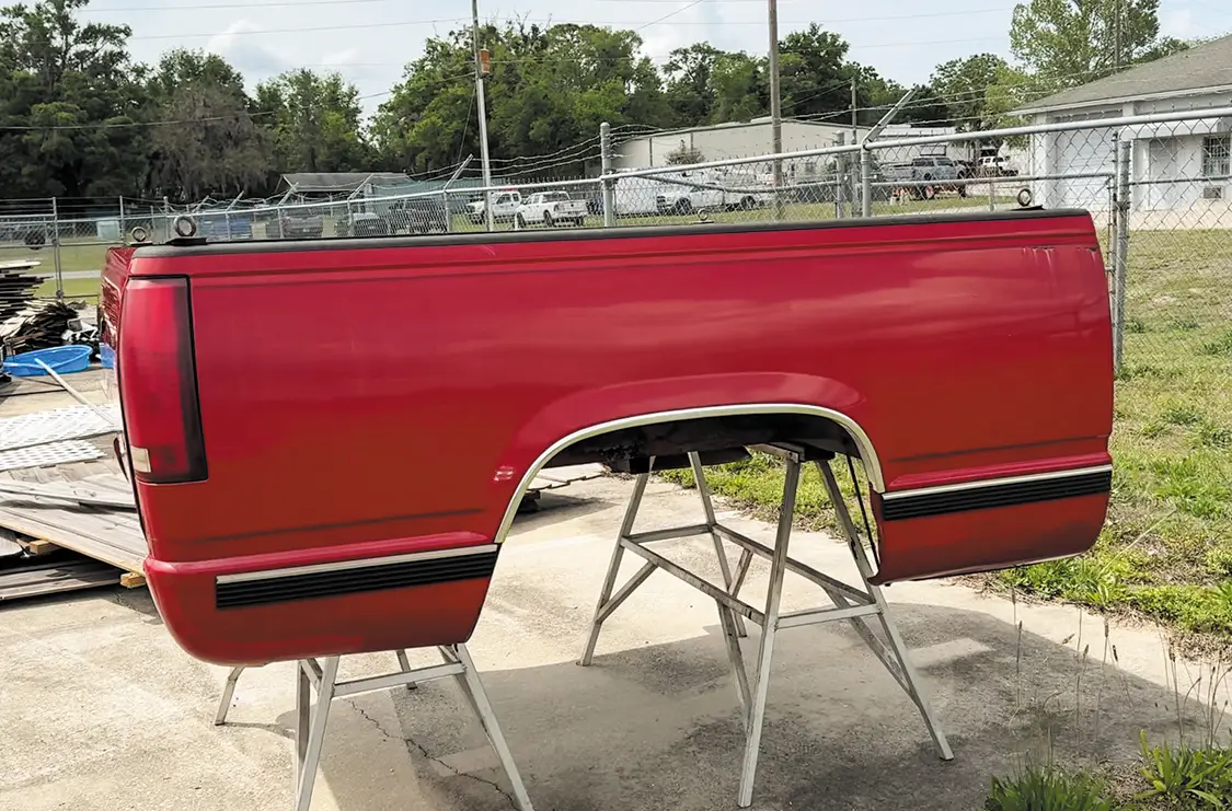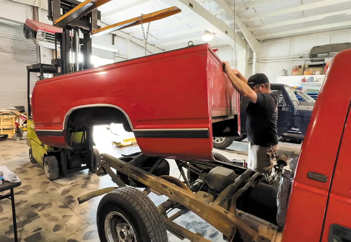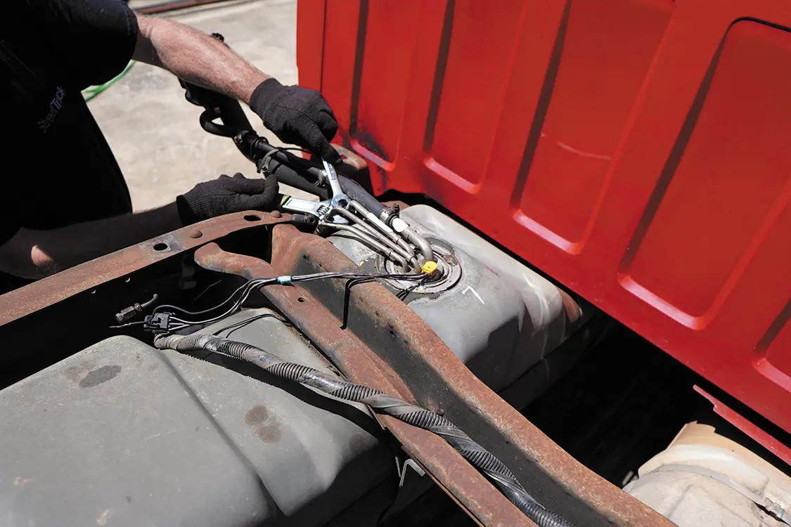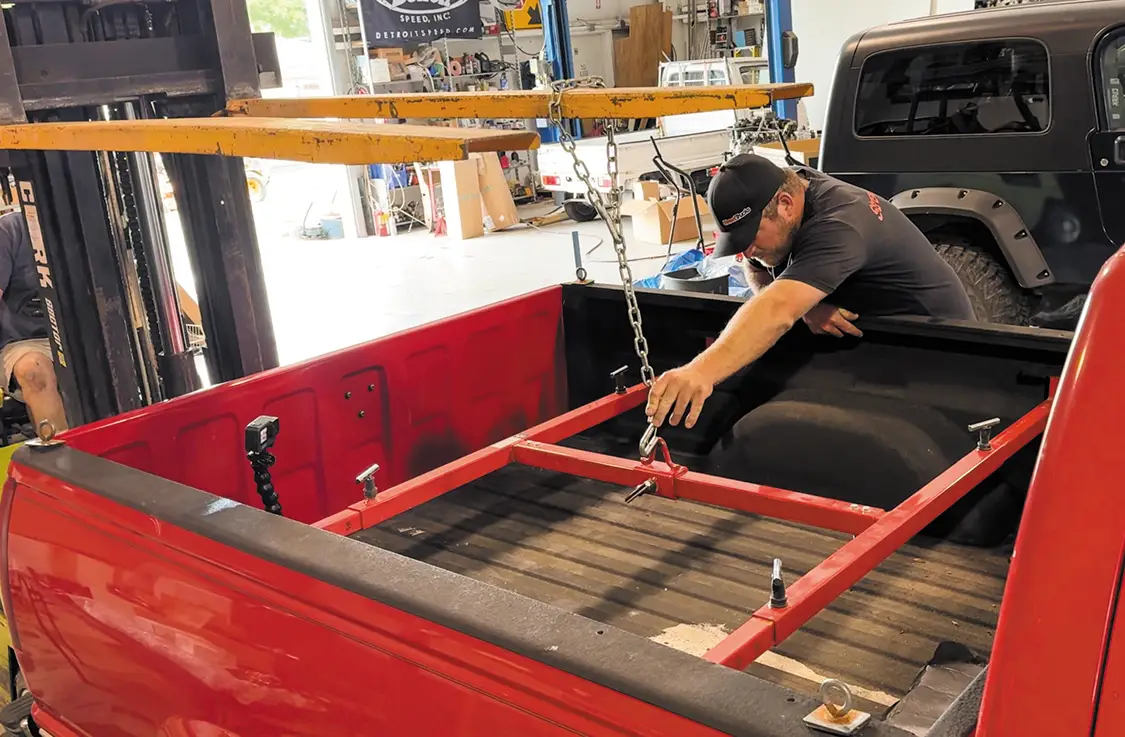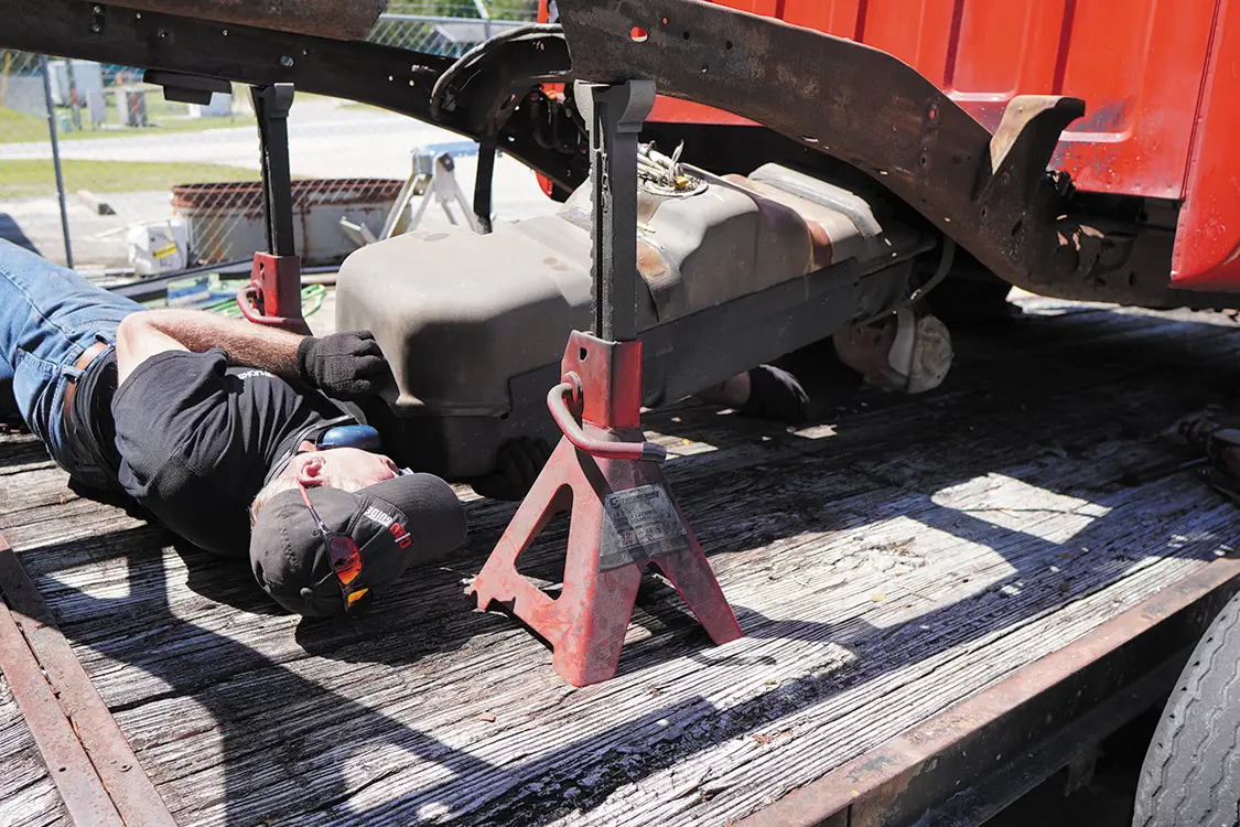 The first thing to remove from the truck was the bed. We’ve done this tons of times, and it goes quicker the more you do. A few bolts under the bed and some screws holding in the gas filler tube were all that we needed to remove.