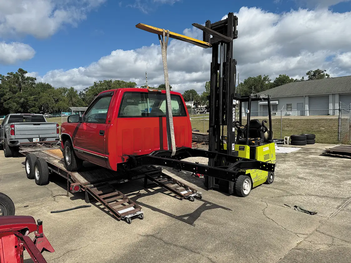 We simply set the bed outside for now and out of the way. Forklift for the win!Here is a look at the stock setup these trucks have. We needed to remove brackets and clean this frame before installing this amazing new suspension.We unbolted the spare tire bracket and threw it out. This won’t be reinstalled.