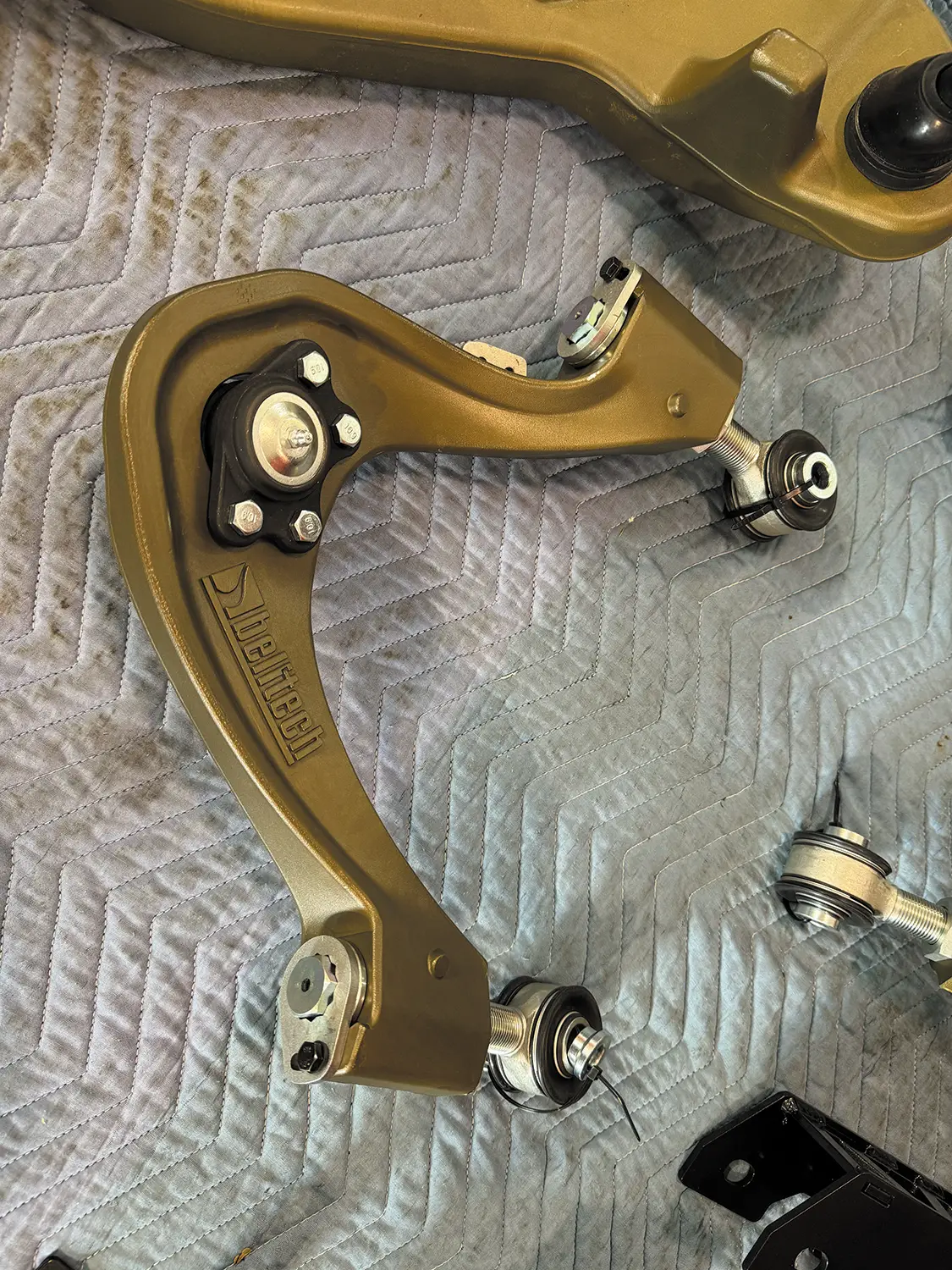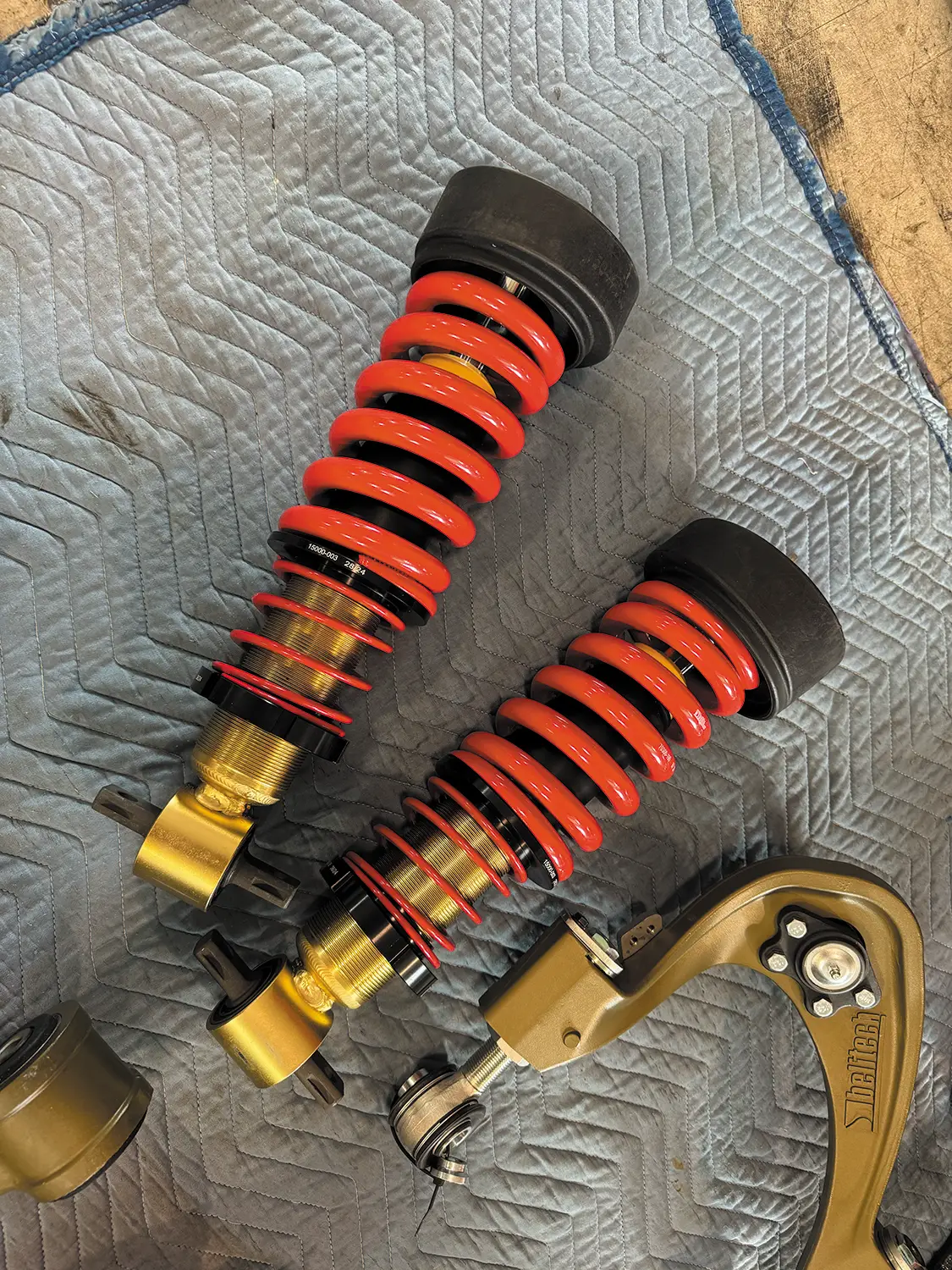 After getting the truck inside the shop and unboxing all the parts in this kit, it’s clear the engineering and build quality is second to none. Just check out these coilovers, brackets, control arms, notch kit, and these massive heim joints. Wicked!