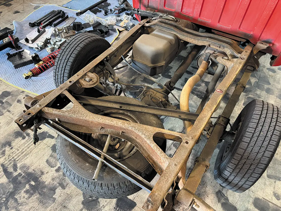 The last thing to remove was the gas tank. You don’t need to do this in order to install the coilover kit, but we want to sandblast and paint the whole rear section of the frame.Time to head to the sandblaster. The truck is less heavy and looks like a junker, but you have to go backwards to go forwards sometimes.