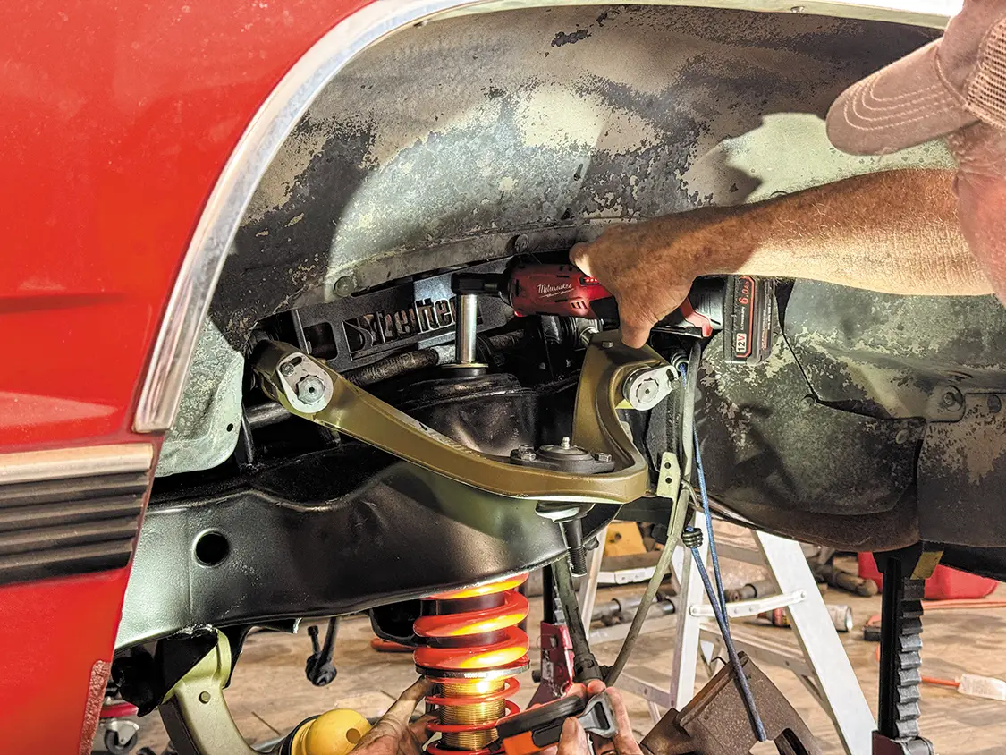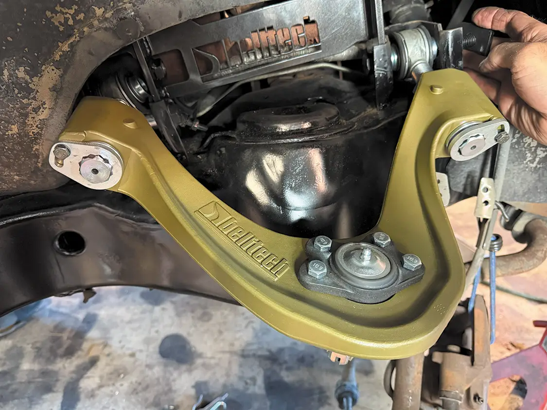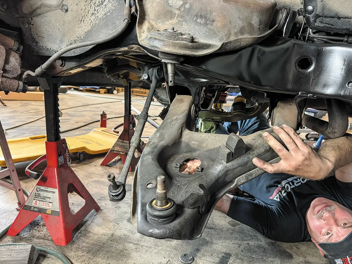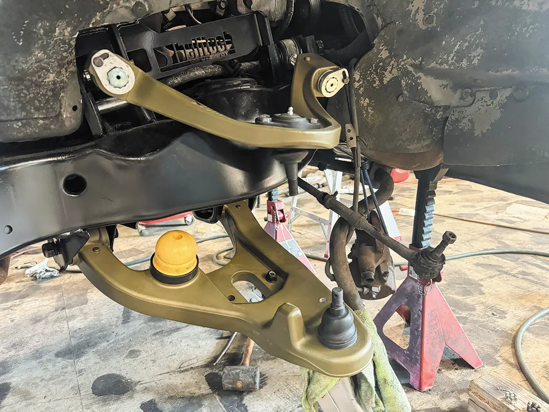 Removing the tie-rod ends was the first move to getting this old suspension off the truck.Next we unbolted the front spindle from the upper and lower control arms.We could now remove both upper and lower control arms since this new Belltech kit comes with all new parts.We won’t reuse these old control arms on any future projects so they will be sold at the local swap meet.The first new part we installed was this upper control arm bracket at the top of the spring perch. This will raise the mounting points and give us a more solid mounting location.Next, we installed the upper control arms into the new bracket.The new Belltech control arms have adjustable heim joints built in, which every alignment tech will appreciate.The lower control arms were next to go on. These new control arms from Belltech are super nice and beefy.Next up was Belltech’s new 3-inch drop spindle. These are built specifically for ’88–’98 GM C1500 trucks, and they deliver a killer stance without sacrificing ride quality. Made from high-strength ductile iron and powdercoated for durability.