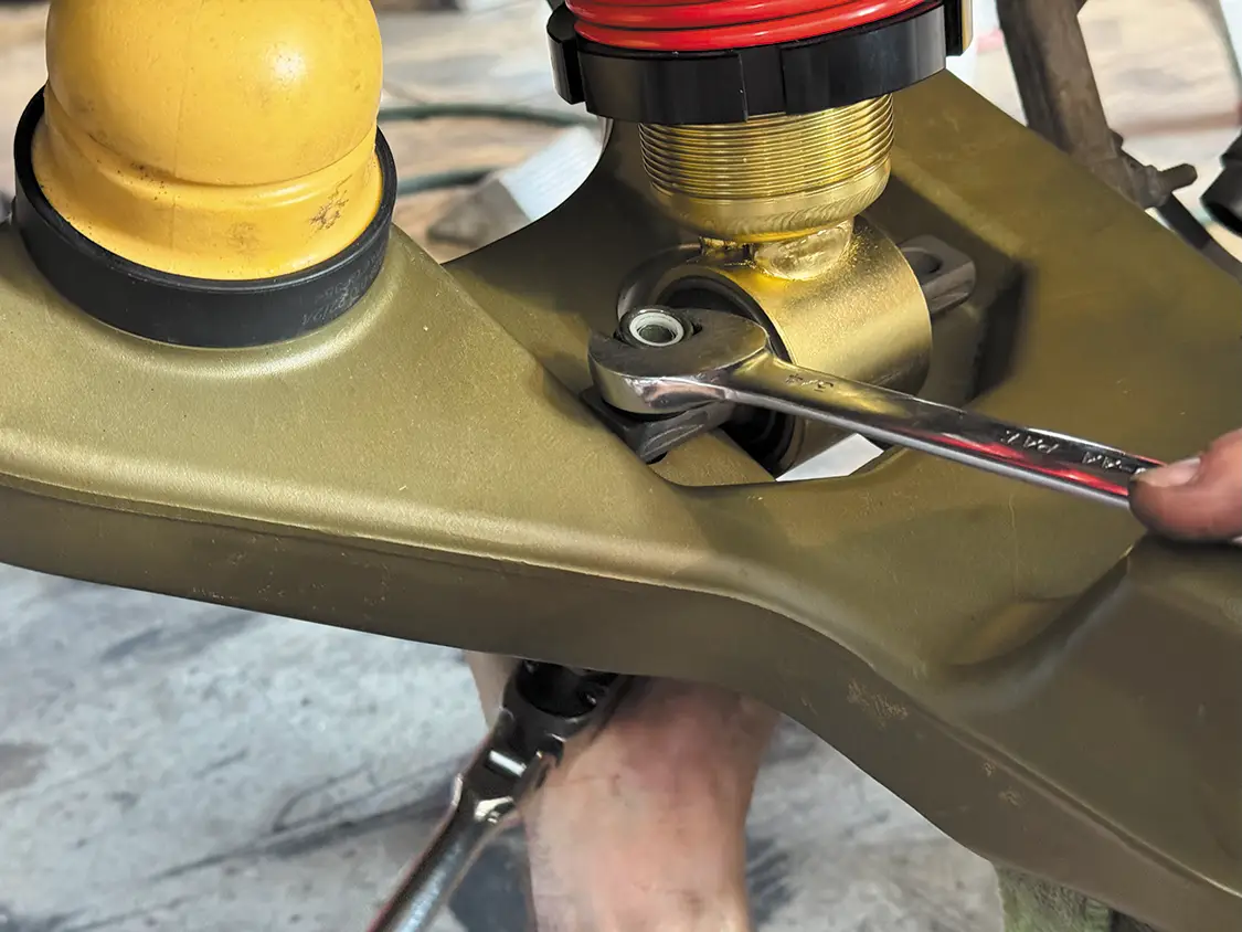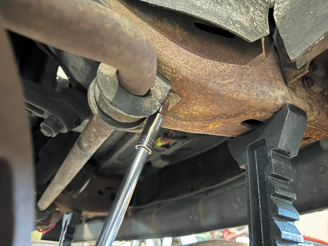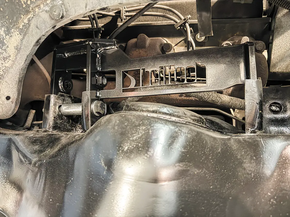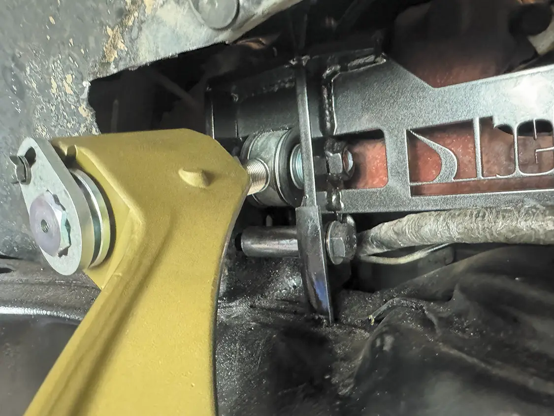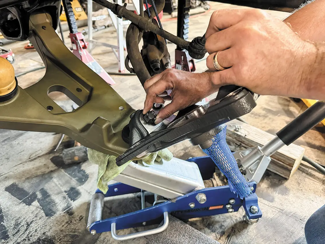 Removing the tie-rod ends was the first move to getting this old suspension off the truck.Next we unbolted the front spindle from the upper and lower control arms.We could now remove both upper and lower control arms since this new Belltech kit comes with all new parts.We won’t reuse these old control arms on any future projects so they will be sold at the local swap meet.The first new part we installed was this upper control arm bracket at the top of the spring perch. This will raise the mounting points and give us a more solid mounting location.Next, we installed the upper control arms into the new bracket.The new Belltech control arms have adjustable heim joints built in, which every alignment tech will appreciate.The lower control arms were next to go on. These new control arms from Belltech are super nice and beefy.Next up was Belltech’s new 3-inch drop spindle. These are built specifically for ’88–’98 GM C1500 trucks, and they deliver a killer stance without sacrificing ride quality. Made from high-strength ductile iron and powdercoated for durability.