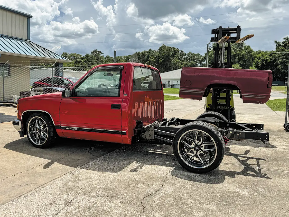 The coilovers were mounted to the top shock mount. We will adjust the spring height once we have the install complete.We then bolted the bottom of the coilover to the lower control arms using the provided hardware.Connecting the top of the spindle to the upper control arm completed the hard part of the front install.Just check out how clean this front kit is. It’s well-built, engineered for performance, and coated to last.We then added the factory brake dust shield to the spindle. Using the provided template we need to trim the shield for a little extra clearance.The Belltech brake caliper bracket was installed next.With the front suspension installed, we then removed the factory sway bars to install the new Belltech bars. These new units mounted directly to the factory bolt locations.Here is a great look at the new front suspension setup, which was complete and ready for the new wheels. It’s such a well-designed kit!We bolted on this set of 20×8.5 and 20×10 Billet Specialties TEC 5 wheels wrapped in Atturo AZ850 performance rubber—245/40R20 up front and 305/35R20 out back. Built specifically for ’88–’98 trucks, the fitment of these Billet Specialties wheels are dead-on.Here is the final look at this beautiful truck and this amazing suspension.Time for a test ride! It carves corners like a sports car and soaks up the bumps in the road like a boss. We can’t explain how impressed we are with this kit.