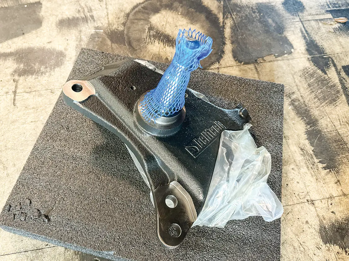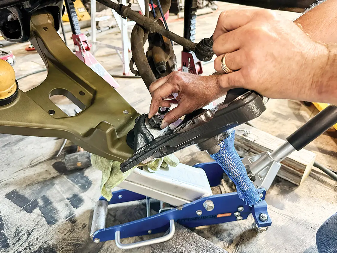 We then added the factory brake dust shield to the spindle. Using the provided template, we need to trim the shield for a little extra clearance.The Belltech brake caliper bracket was installed next.