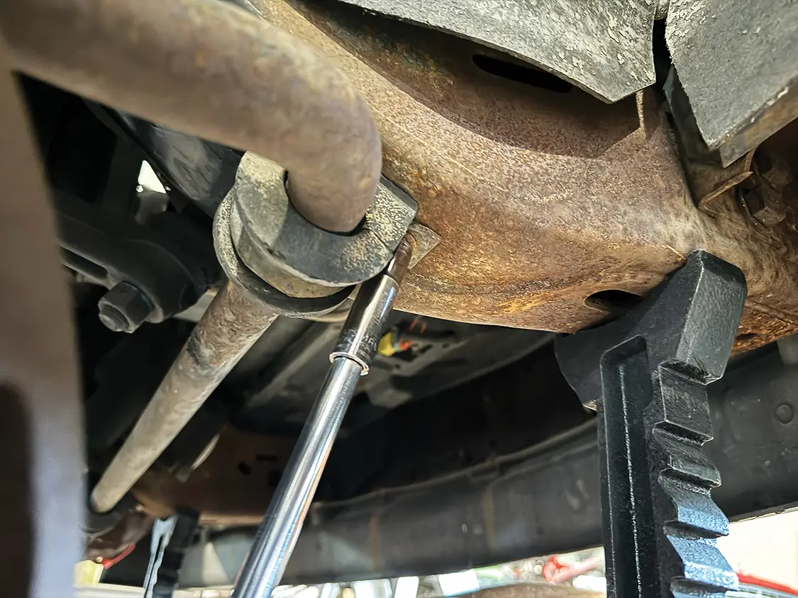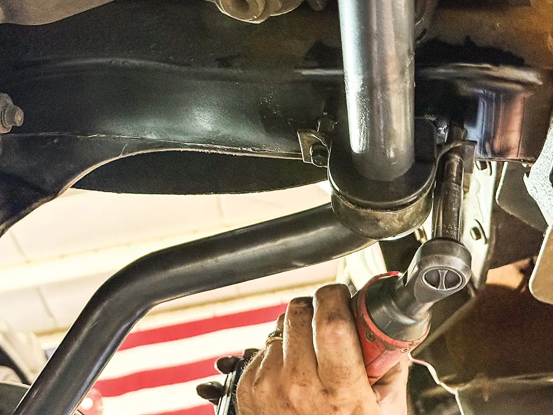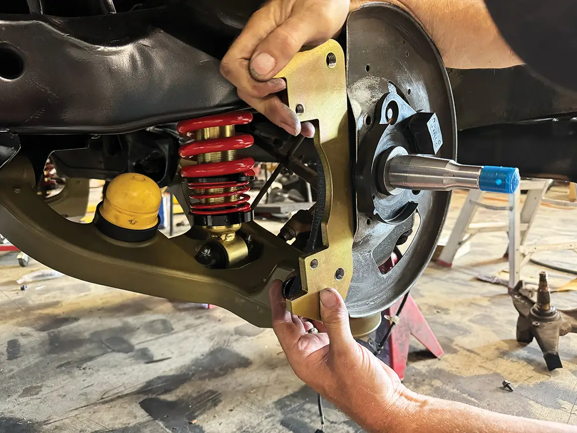 Removing the tie-rod ends was the first move to getting this old suspension off the truck.Next, we unbolted the front spindle from the upper and lower control arms.We could now remove both upper and lower control arms since this new Belltech kit comes with all new parts.We won’t reuse these old control arms on any future projects, so they will be sold at the local swap meet.The first new part we installed was this upper control arm bracket at the top of the spring perch. This will raise the mounting points and give us a more solid mounting location.Next, we installed the upper control arms into the new bracket.The new Belltech control arms have adjustable Heim joints built in, which every alignment tech will appreciate.The lower control arms were next to go on. These new control arms from Belltech are super nice and beefy.