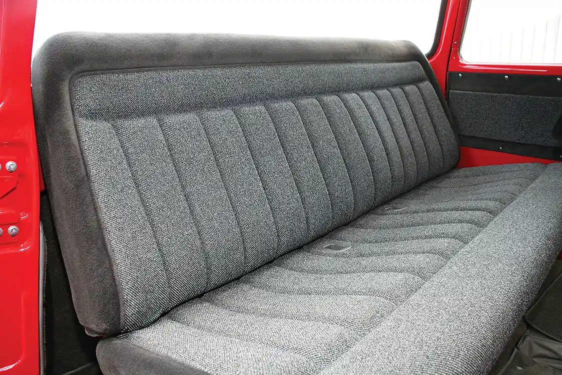 • Late-model Chevy bench seat, factory dark gray cloth and light gray tweed insert