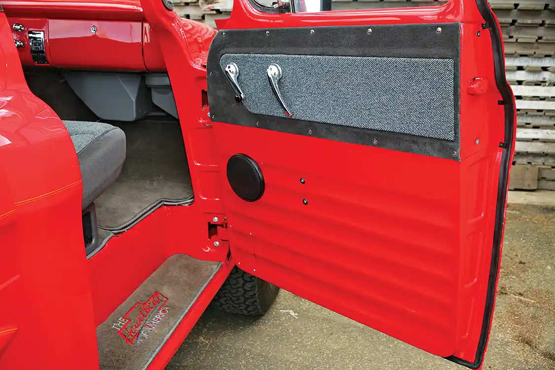 To maintain the original radio location and appearance, Larry had the crew at Benchmark Fab install an Auto Sound head unit into the dash with a 200-watt amplifier. A pair of 6-inch dual- cone speakers was installed in the door panels. Two 6×9-inch dual- cone speakers were mounted in custom enclosures in the rear lower cab corners behind the seat.