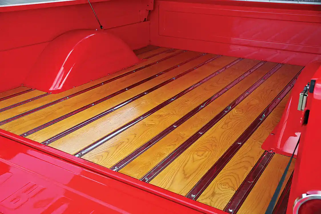 Big Red’s sheet metal was straightened and trued by Benchmark Fabrication. Benchmark also fabricated a custom aluminum tonneau cover that fits precisely inside the bed rails. After the sheet metal was massaged, it was given multiple coats of sanding primer. Then all of the body surfaces were block-sanded smooth. Single-stage PPG Red urethane is the color of choice. A local pinstriper laid down orange and yellow stripes and painted the Chevrolet embossing on the tailgate and grille black. A pair of quad halogen headlights flanks the rechromed grille. The cab was fit with new polished stainless steel deluxe, window trim, door handles and chromed side mirrors.