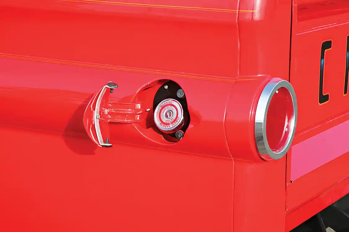 Big Red’s roar and power comes from a Chevrolet 350-ci small-block. This small-block was disassembled, cleaned, measured and machined by a shop in Long View, Washington. Larry took the liberty of assembling the engine with all of the right performance components himself. A pair of stock cast iron cylinder heads was fitted with 1.94 intake valves and 1.60 exhaust valves. The cylinder head valve assemblies are covered with a pair of B&M Vintage aluminum valve covers. An Edelbrock 650-cfm four-barrel carburetor and K&N air filter sit on top of a Holley dual-plane aluminum intake manifold. A stock long neck water pump circulates ample coolant through the engine and cross-flow aluminum radiator. The engine’s electrical juices are energized and transmitted through a GM HO coil linked to the GM HEI distributor, which flows through Taylor 9mm spark plug wires to designated spark plugs. The engine’s exhaust gases pass through a pair of Hedman 1 5⁄8-inch- diameter headers and on into a 2 ½-inch-diameter exhaust and Flowmaster mufflers. The crew at Phil’s Transmission in Corvallis installed a Stage II shift kit into the built GM TH400 transmission. It was teamed with GM 208 transfer case.
