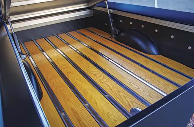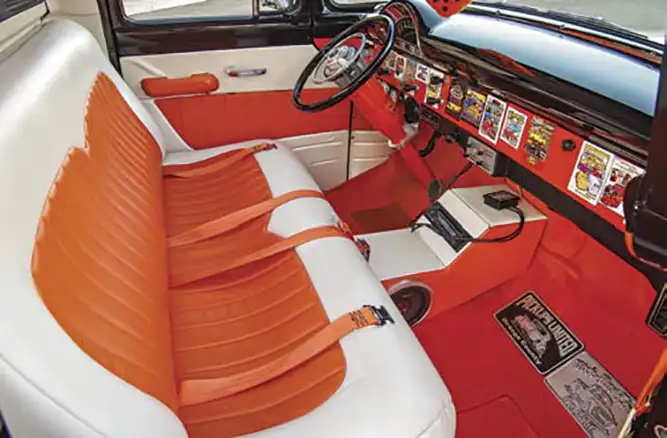 An aftermarket Pro’s Pick bed was fitted with a set of Dan Carpenter bed tubs to accommodate the fat rear wheels and tires, which required slight modification to the Bruce Horkey red oak bed wood and polished stainless steel runners. The bed wood was actually raised 5 inches to clear the rearend housing with a custom- fabricated bed subframe. Mike Sutton of Long Beach Threads applied the black bimini cloth to the aluminum bed cover that opens via electric rams. Seatz Manufacturing wrapped the Rod Doors’ roof, doors and cab panels to complete the complementary orange and pearl white interior.