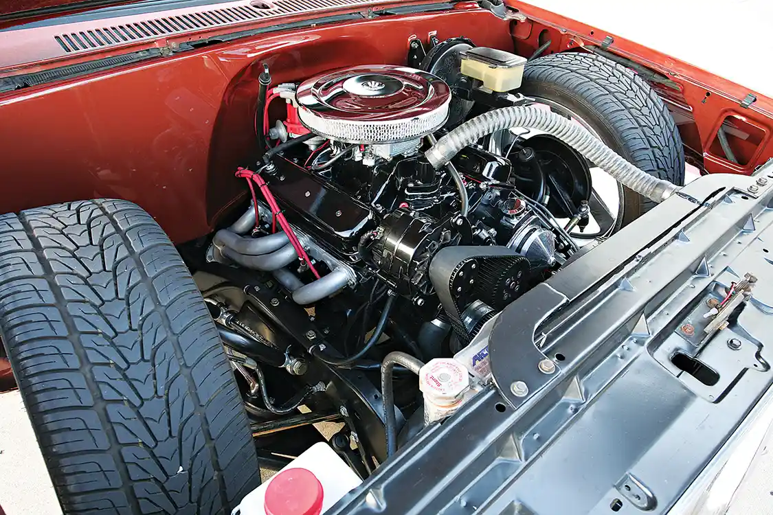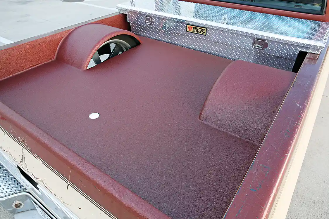 Once all of the pieces were back, assembly began. After the frame was back together as a rolling chassis, he got to work on the engine. Since the cab was off, he had Pristine Paint & Autobody shave the firewall and inner fenders and paint them to create a subtle contrast. Meanwhile, the bed was covered in new sheet metal and sprayed with color-matched Line-X, since this truck would get some use.