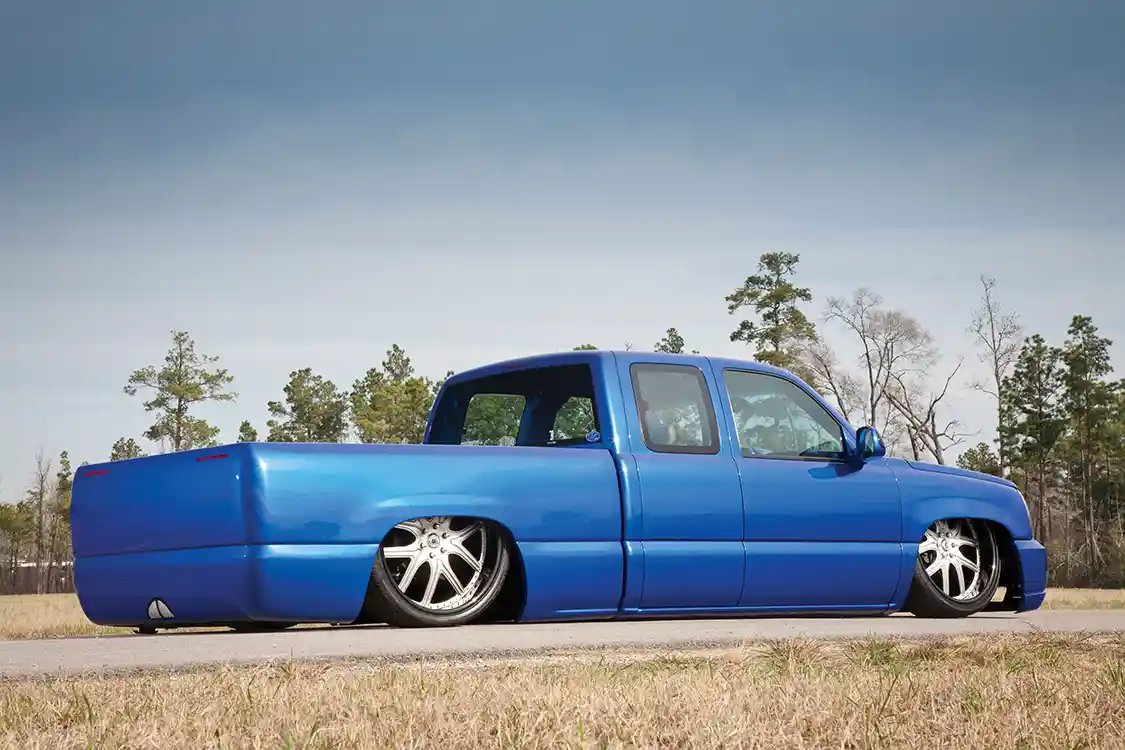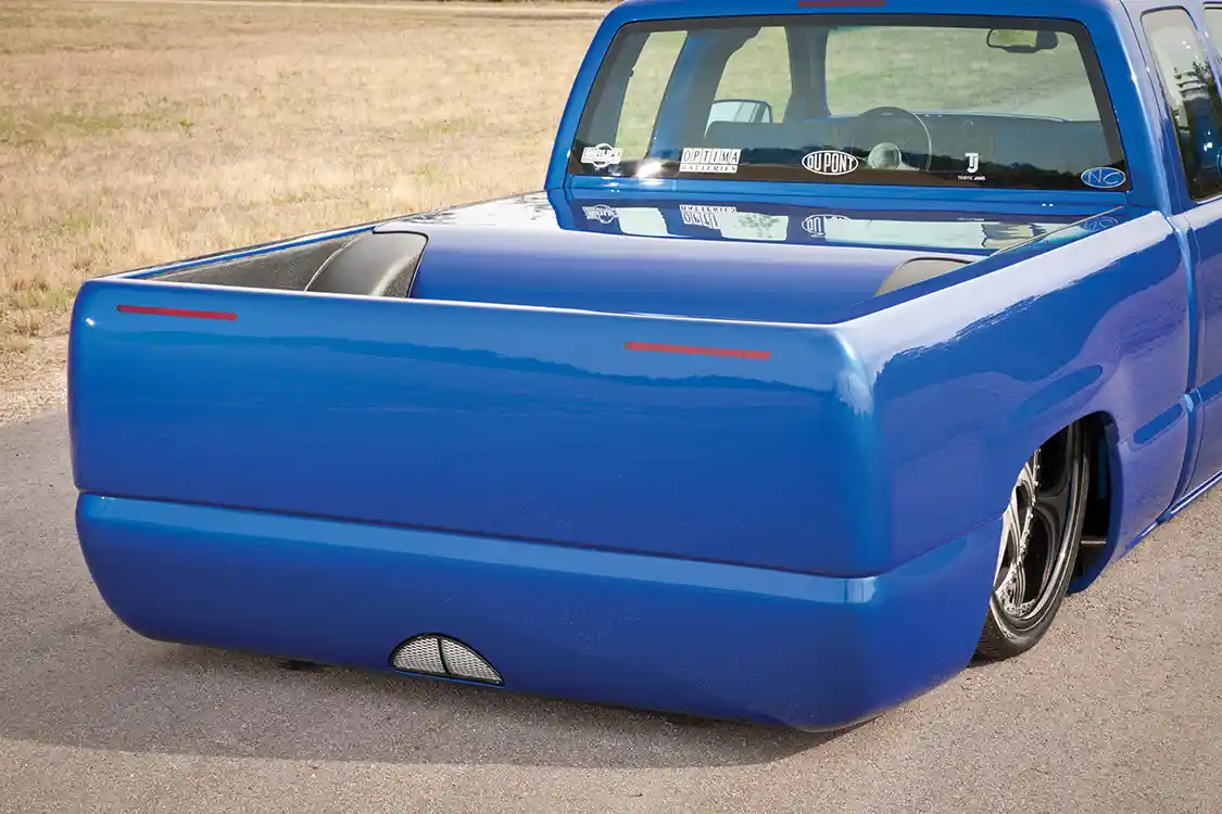 Back in the day, the truck was built to lay over 24s, which were considered huge at the time. There was actually enough room for Troy to stuff a set of 26-inch Asanti wheels. To make this happen, the rear suspension received a 2-link and was equipped with AirLift Dominator 2,600-pound ’bags. To tuck the 11-inch-wide wheels, the factory rearend was shortened. The front suspension was airbagged, and the front mounts were raised to allow the truck to come down further. The gas tank also had to be raised so it wouldn’t hang below the frame.