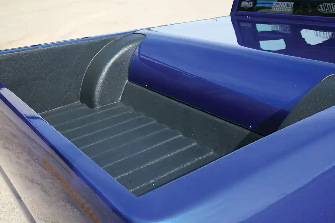 THE TRUCK FEATURES A BLOWTHROUGH PORT BECAUSE THE SPEAKERS WERE BUILT INTO A CUSTOM BOX INSIDE THE TRUCK’S BED.