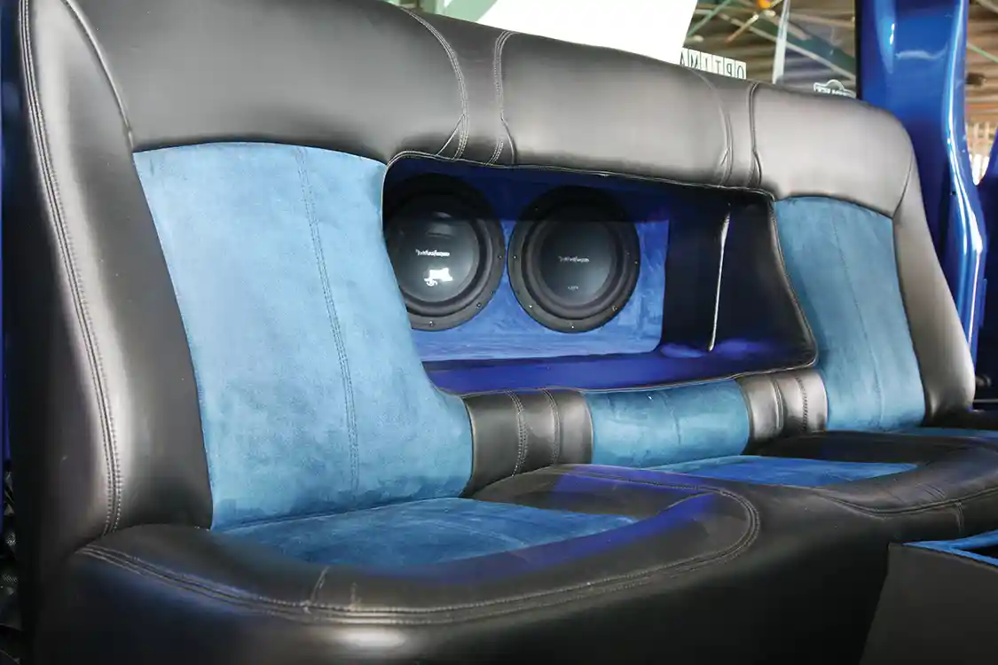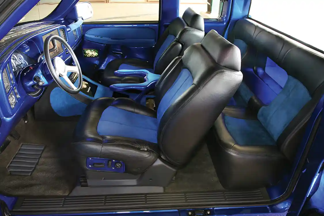 With everything ready for paint, Troy used DuPont Daytona Blue to coat the exterior. The paint was also applied to the fully ’glassed panels throughout the interior. The upholstery was done by McFarland Upholstery in Buckley, Washington where the crew used a black leather and blue suede combination that tied the interior to the exterior.
