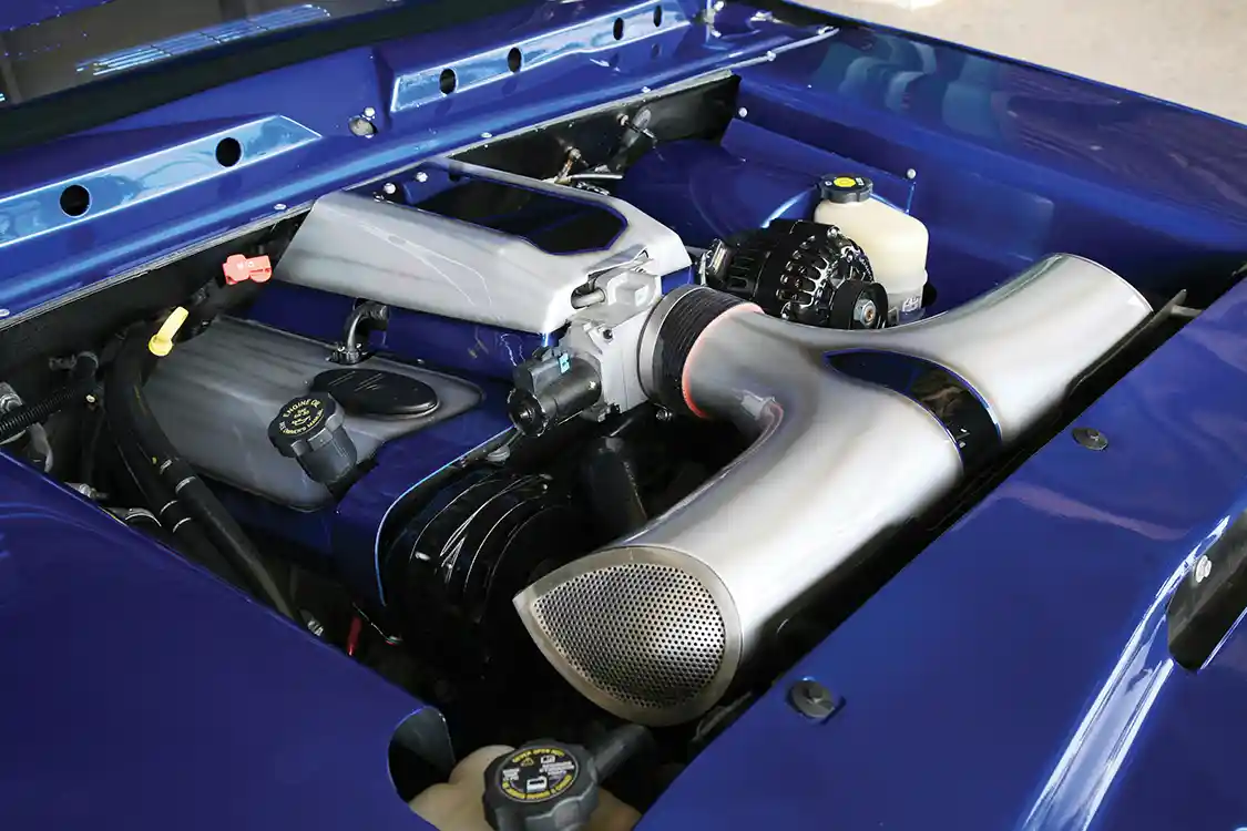 THIS AIR INTAKE AND COVERS GIVE THE ENGINE COMPARTMENT A CUSTOM LOOK.