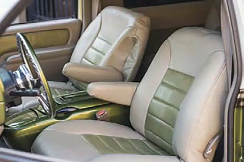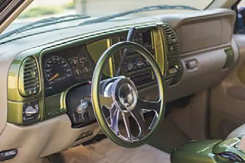 The cruising chamber was the last area of custom concern and Chas had Shawn’s Upholstery tackle most of it. The factory front buckets and rear bench were covered in a combination of tan leather and green vinyl. Chas personally wrapped the door panel inserts and rear panel inserts in green vinyl and tacked fresh tan carpet to the floorboards. A smoothed and painted dash cluster, AC vents and center console bring some additional color to the cockpit, while a Billet steering wheel handles lefts and rights in style. Escalade inside door handles lend a subtle dash of bling, while blacked out windows deflect prying eyes.