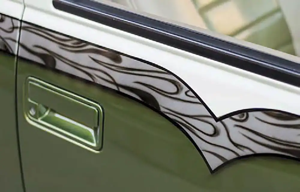 Once the style was nailed with the perfect rim-tucking and framelaying stance it was time to modify the metal and spray some new hues. To slick and smooth out the body, Chas relied on Kevin York at Kreative Colors. The roof rack and antenna were shaved and a Street Scene windshield cowl was installed. After the subtle mods were completed, Kevin laid down the Matrix Cool Vanilla and Citrus Green Metallic two-tone broken up by Aluminum Silver airbrushed flames by Shane Meeker bordered in black pinstriping. The paint detail even flows into the doorjambs, and the exterior artistry is topped off with LED taillights, clear corners and markers, a smoothed and painted rear bumper, a chrome smoothie front bumper and a billet grille insert and painted Bow Tie emblem.