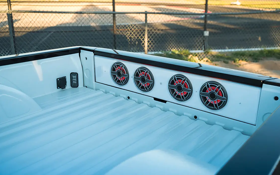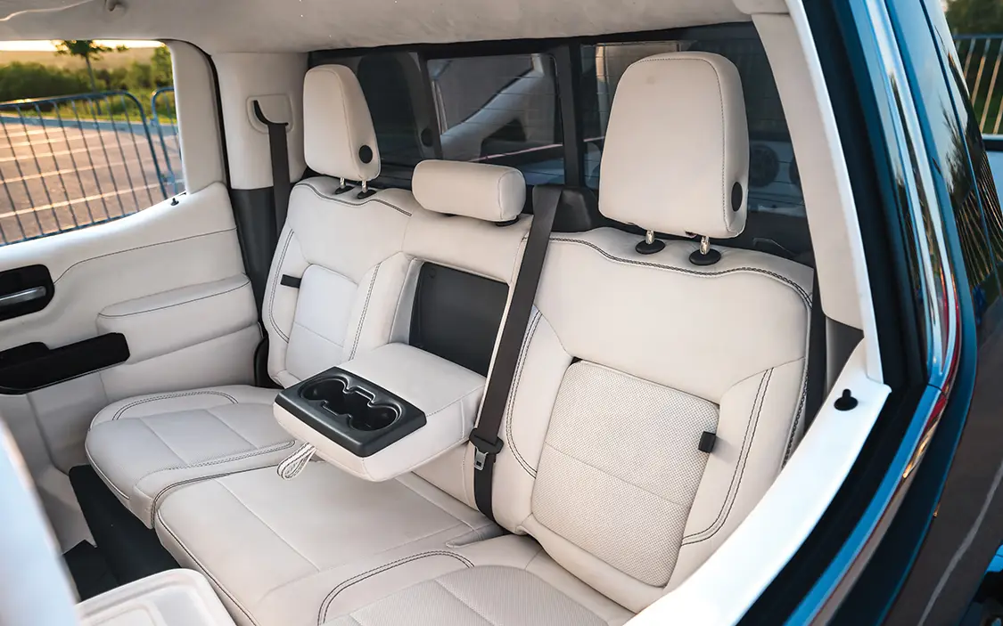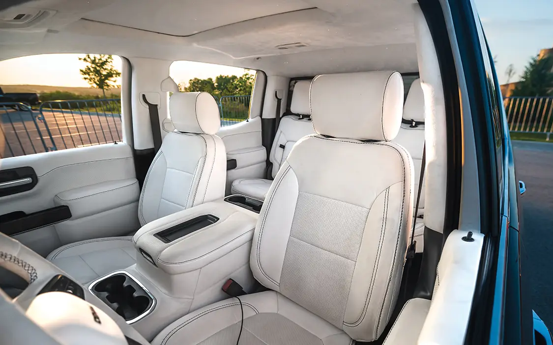 Under the hood, Rodrigo kept it simple and smart. The factory 6.2L V8 and stock trans stay in place, providing reliable power and easy service without inviting any weird gremlins. Outside, the truck retains its factory black paint, which hits hard with the wheel/tire combo and the suspension drop. Inside is where the script is flipped with white German leather to create the perfect contrast to the black paint. Axman at KTC Audio in Aurora, Colorado, handled the audio and subs, so the tunes hit as clean as the lines.