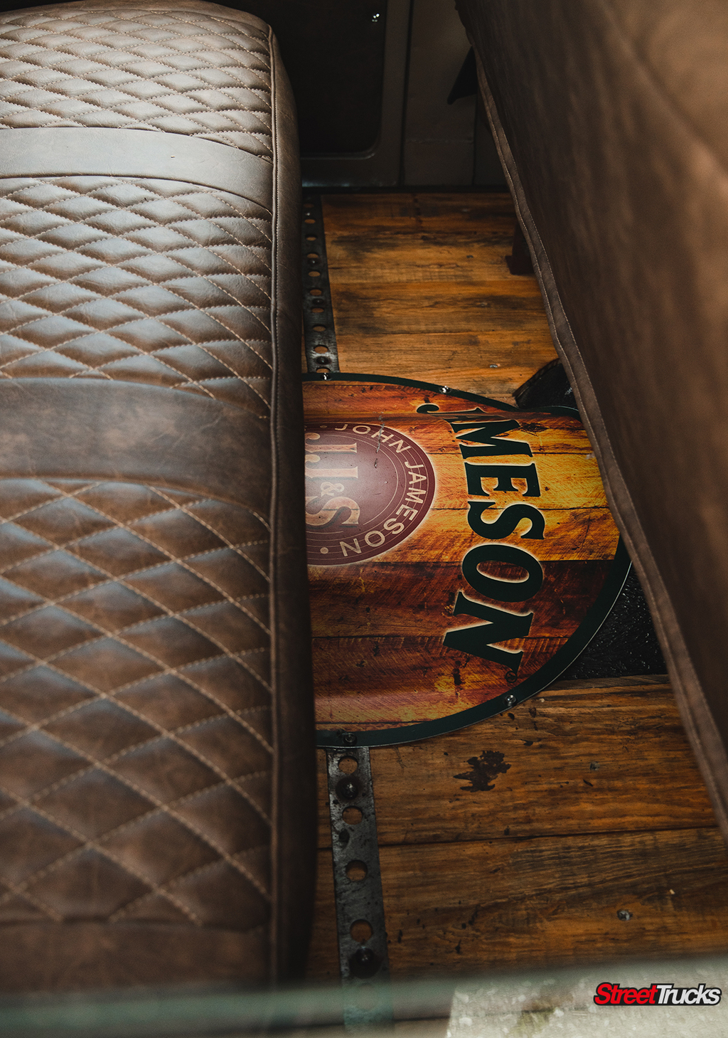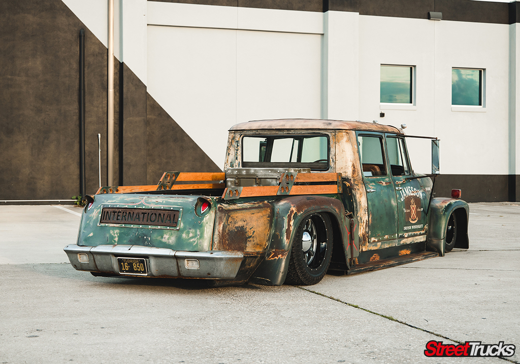 With this realization in mind, Dewey moved on to the International’s exterior to truly make the truck his own. Now, the truck already had a great natural patina going for it, which was preserved, and even improved upon to get the look just right. Dewey thought some sort of loose theme to the truck would be cool, and the first thing he thought of was Jameson Whiskey.