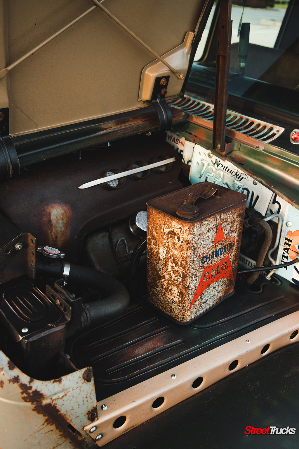 “My wife had seen this 1965 International Loadstar for sale, and she fell in love with it immediately,” Dewey says. “She envisioned the truck done up in true rat style with lots of patina and a combination of unique parts. At first, I wasn’t so sure how I felt about the idea, but as we made progress on the truck, I started gaining a whole new outlook and appreciation for the work and imagination that goes into the best rat rod builds.”