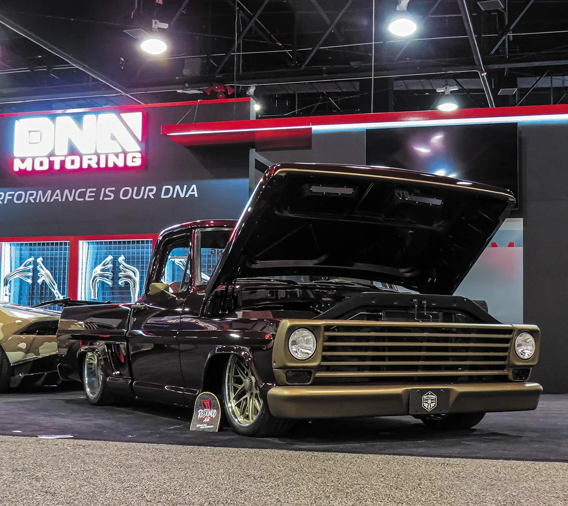 The second truck showcased by Fat Fender Garage this year was a 1967 F-100, affectionately nicknamed “Stark.” It was displayed at the DNA booth and featured remarkably straight body lines, a Whipple supercharged Gen 3 Coyote engine, and a 6-speed Tremec transmission. Additionally, it boasted a stunning maroon paintjob accented with bronze details, truly living up to its name!