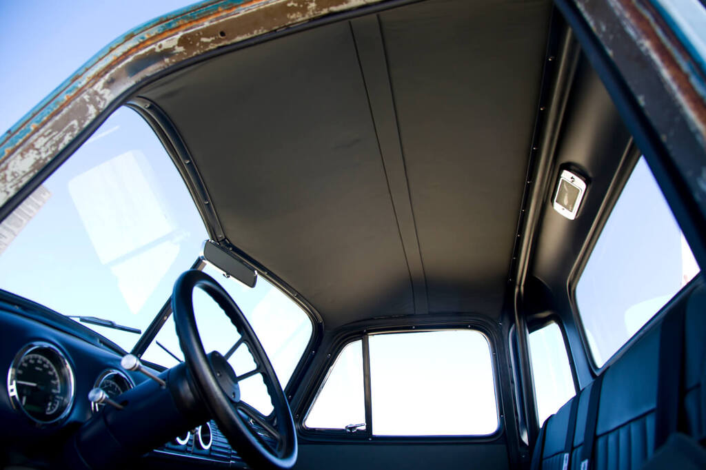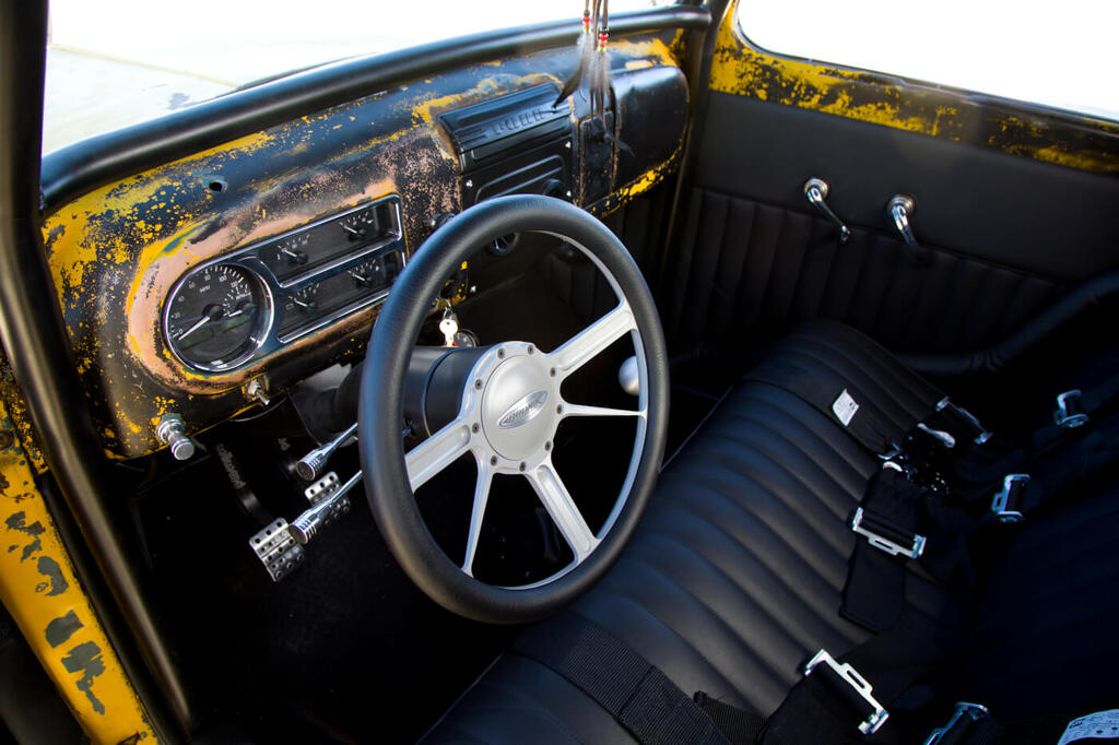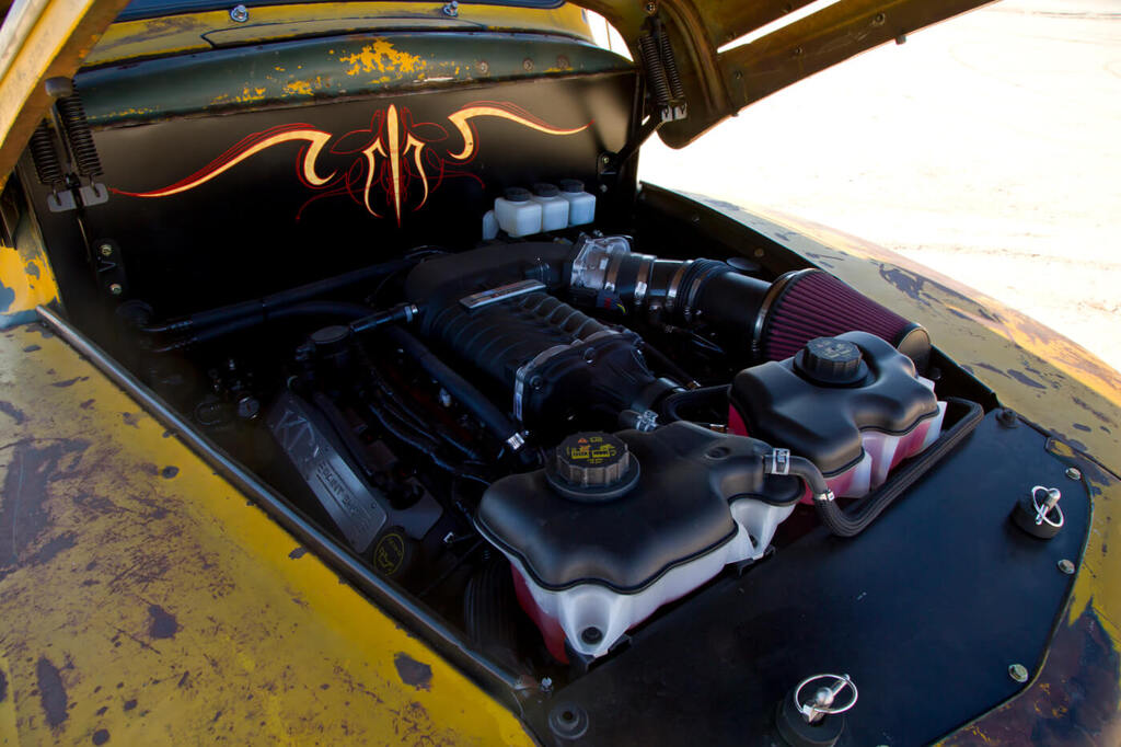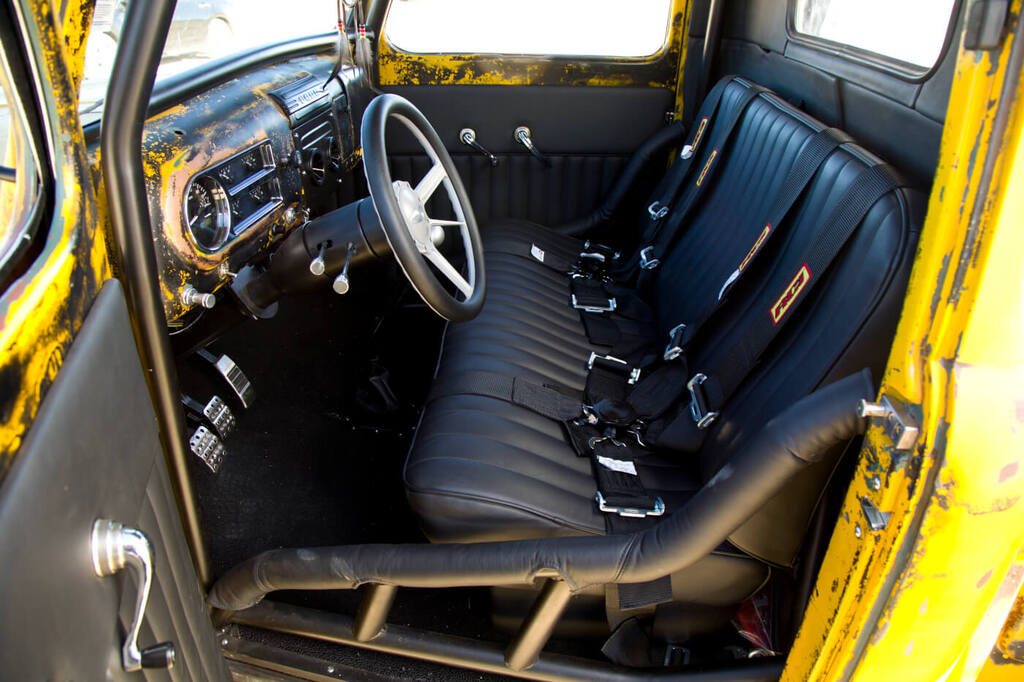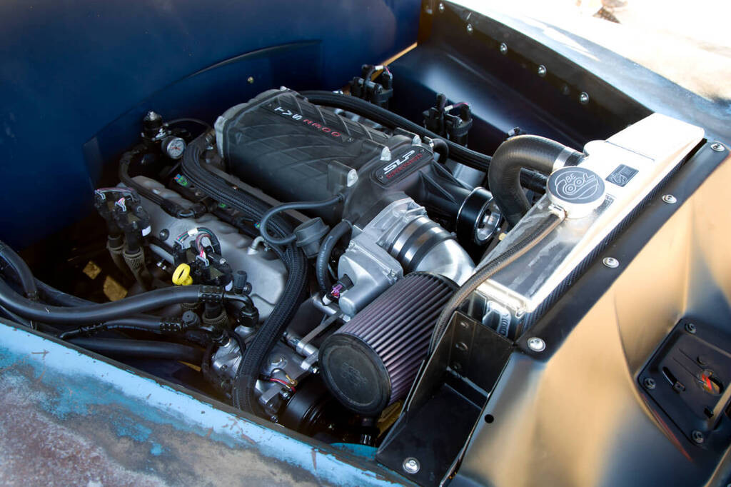 While the subject of engines is fresh, let’s take a look under the hood of each truck. KC’s F1 is equipped with a fresh-from-the-crate Ford Performance 5.0L engine outfitted with a rowdy Roush Performance supercharger. Steven’s Chevy 3100 is no slouch either; it’s running a 408 LS mill with an SLP Performance supercharger. Both engines are capable of big power numbers, which might be missed by critics who’ve written off the “junk” trucks at first glance. “Aside from those who walked right passed the trucks without knowing exactly what they were looking at during SEMA week, there were way more curious onlookers who stopped to take a closer look. Most were surprised to see that these were pretty much brand-new trucks minus the body panels,” KC said. “Those who took the time to inspect these builds saw that we meant business … They both have that old-school farm truck feel, but with an undeniable modern performance twist.”