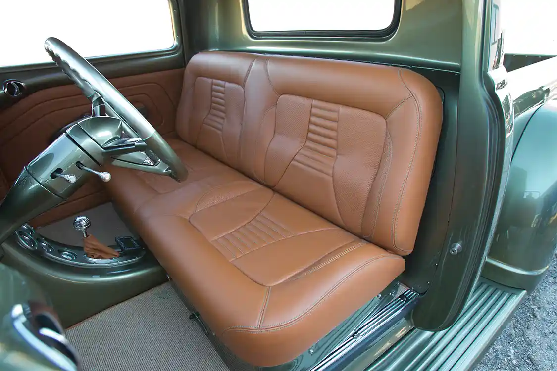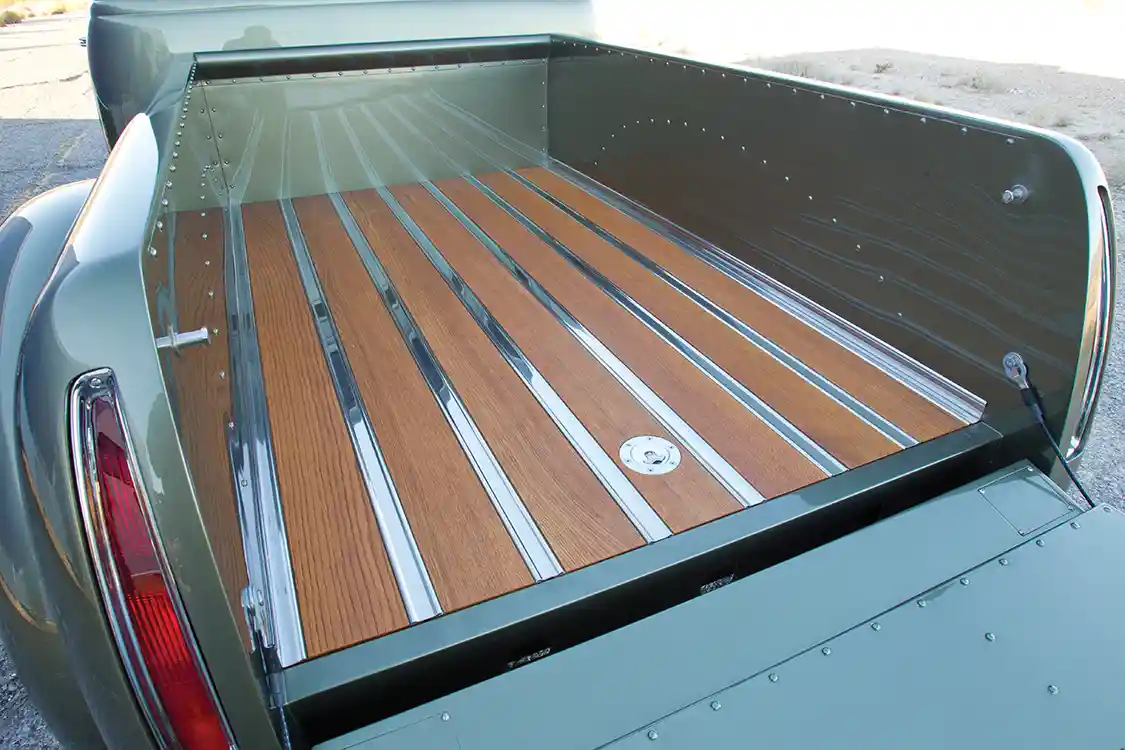 Dermie didn’t want his truck’s performance to outdo its aesthetics, so he focused a lot of time and effort into massaging the truck’s body into the masterpiece you see here. Chevy certainly did this truck justice when it rolled off the assembly line, but Dermie stepped it up a notch, extending the cab of the truck 6 inches through the doors, chopping the roof 3 ½ inches, building a completely custom bed with a white oak floor, pie-cutting the hood and finishing it off with unique touches, like custom bumpers, modified Rock Valley running boards, vintage GM car door handles, Cadillac taillights and Mercedes E-Class headlights. The truck is topped off with PPG Lexus Desert Sand paint and polished to a remarkably deep shine.