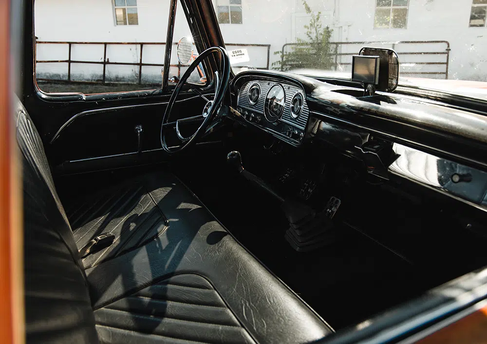 Inside the cab, Craig looked to follow the same approach as the exterior with some very mild yet noticeable upgrades. The factory F-100 seat frame was reconditioned and expertly rewrapped in black vinyl upholstery by Riggs Bros Auto Tops and Interiors in St. Charles, Illinois. Next, an Edge CTS2 monitor was stealthily positioned underneath the factory speaker grille—it easily flips up when it’s time to drive. This allows Craig to monitor all the vital diesel engine data while still retaining the factory gauges, which still all properly function. To further promote optimum performance as well as continuing to hide key components in plain sight, a Hydra Chip has been tucked away inside of the ashtray.