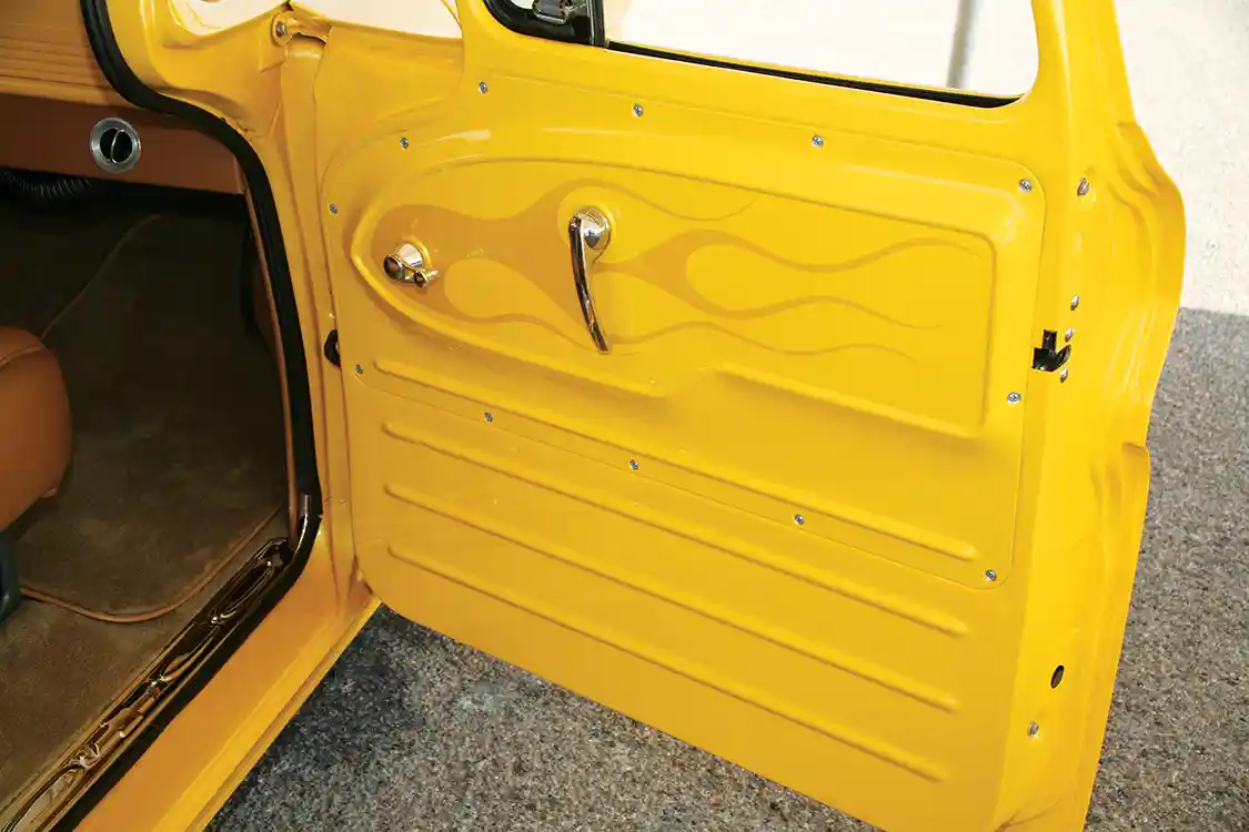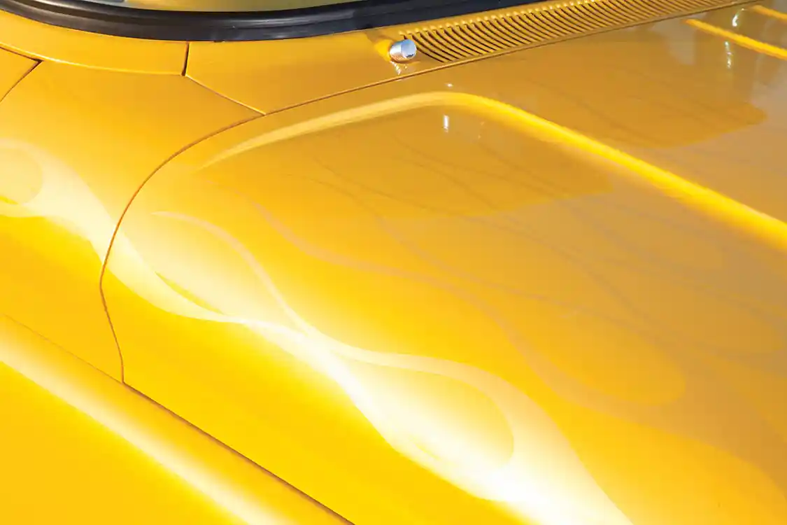For the body, David opted to shave a few things and clean up the overall look, while still keeping things original. He went the same direction with the engine, dropping in a dressed-up 350 with Edelbrock and Billet Specialties goodies to add a bit of reliability and ease of use to the restoration. The body resto included keeping the original trim intact with a complete re- chrome, he smoothed a few things out and added a Sir Michael’s roll pan out back. Bright Caddy Yellow was the color of choice for the respray, which was also handled by Chaotic Rods & Customs. Of course the Chaotic paint job is completed with the addition of Pat Maxwell ghost flames.