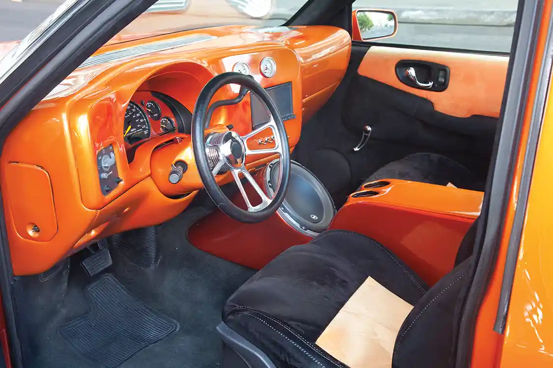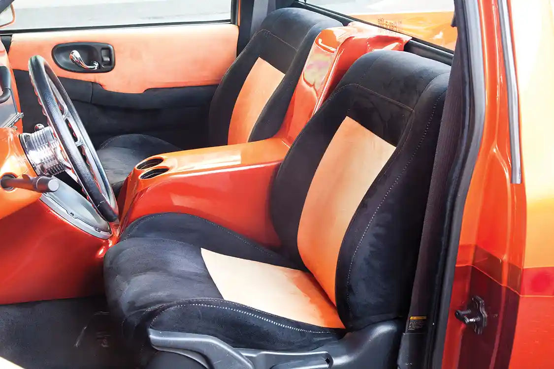 Next up: interior. For this step, Derrick wasn’t going to a relative. Jeff at JW Kustoms handled the stitch work and door panels, while Derrick did the dash and console. The suede is black and orange, and everything else—including the aforementioned dash and console—is painted orange to match the exterior.