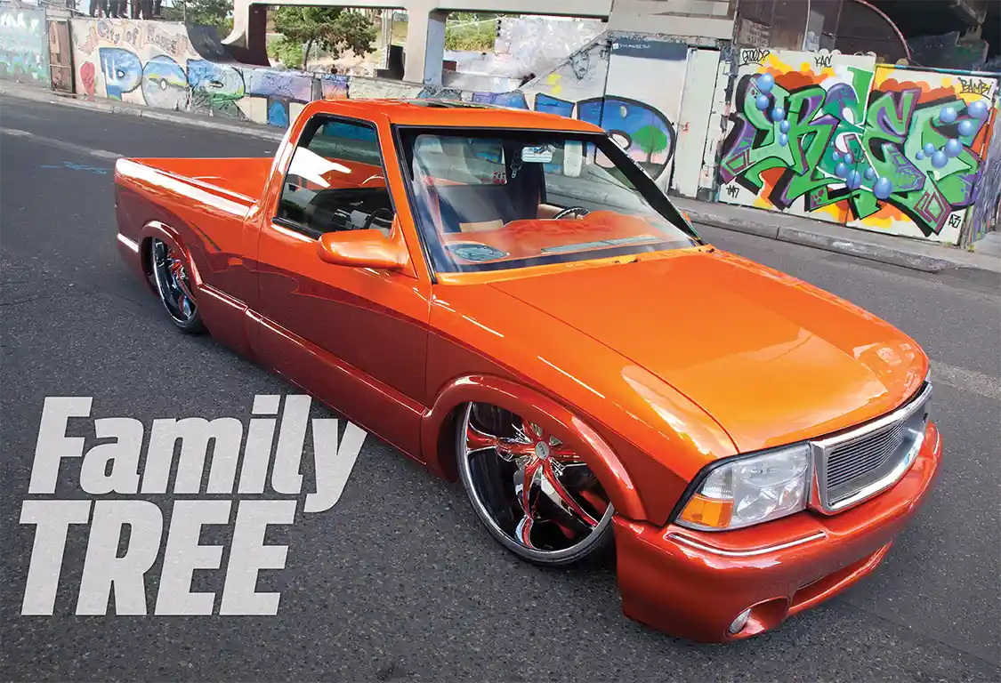 Seven years after he bought the truck, Derrick’s S-10 is cruising the streets on big rollers. So that means he’s going to tear it down and build it again, right? No, according to Derrick, he’s done with the orange S-10, and it’s currently up for sale. Heck, it might even be sold by the time you read this, because it’s clearly quite the killer ride. What will he build next time? We don’t know for sure, but we do know that he’s got a great team ready to help him out, and they all share the same family tree.