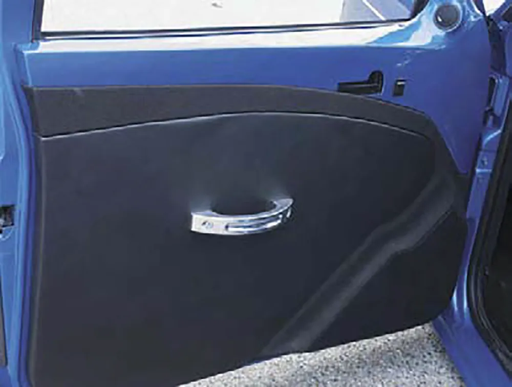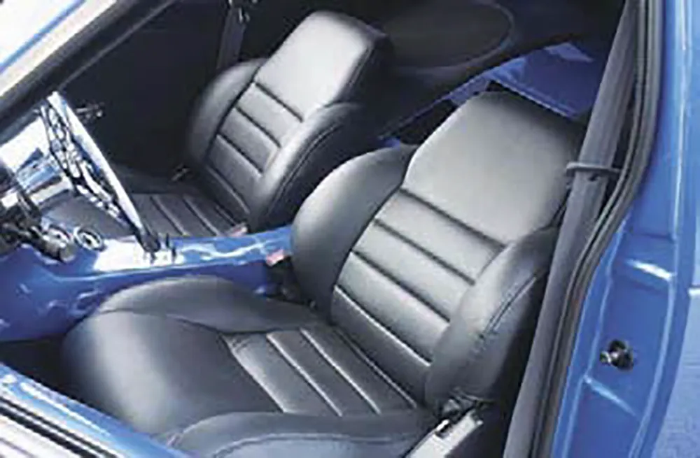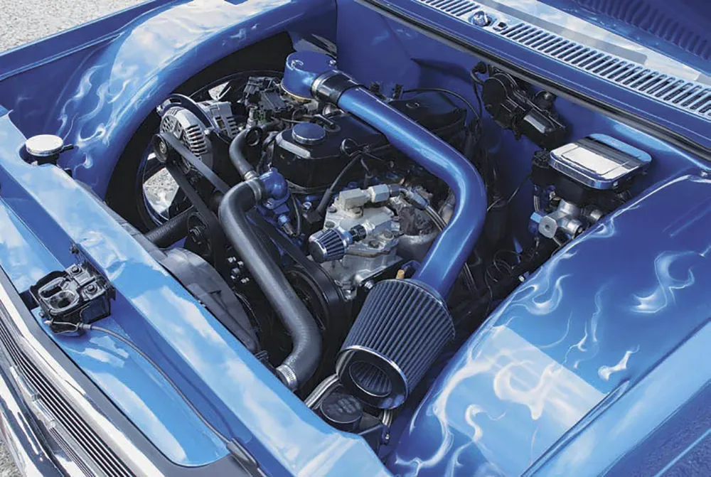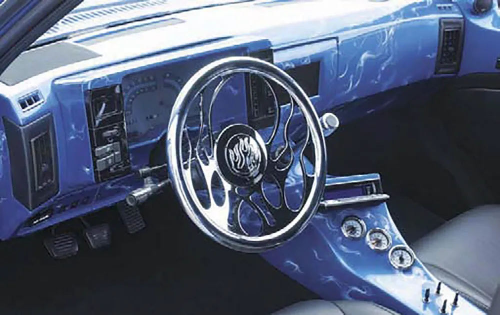 Under the hood lies the original 2.5L four-cylinder engine, though the block has been bored 30 over and rebuilt. For extra performance, Eric made a custom cold-air intake and added an MSD ignition coil, electric fan and a Flowtech Raptor turbo performance muffler. A York beltdriven compressor was bolted on for the air system, along with a custom- built 200-amp alternator for the stereo. The four-banger is nicely displayed in the revamped engine compartment. It was cleaned up with a smooth firewall and radiator support, and to cover the wheels, custom tubs were made to fit the inner fenders. True fire graphics were added to the fenders, dash and console by Full Blown Kustom of Eugene, Oregon.