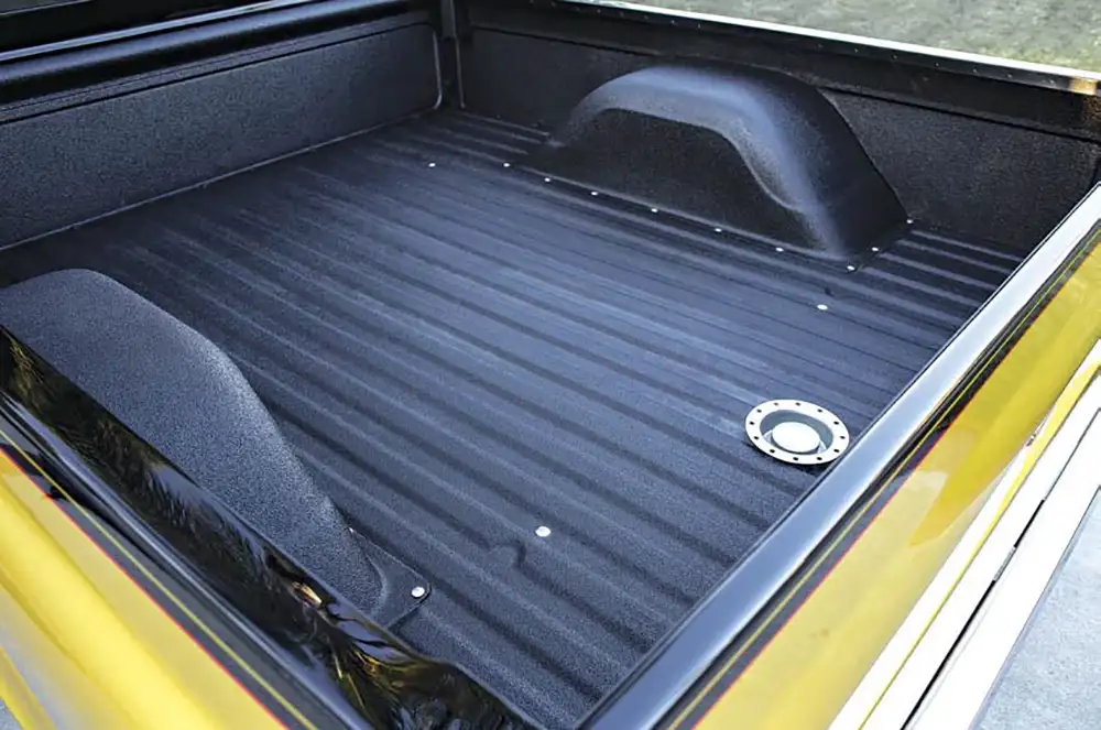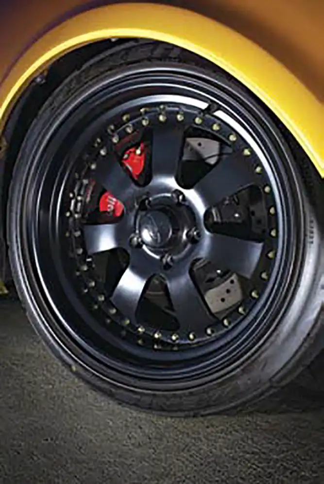 Of course, half of performance driving is braking control, so a full Wilwood disc brake system was installed, including 14-inch rotors with six-piston calipers up front and an ABS power brake booster with Wilwood master cylinder. To lessen body roll, polyurethane bushings, engine and body mounts from Energy Suspension were used. Intro ID-301 wheels (18×10 inches) were powder-coated black and assembled with gold hardware. The rims were wrapped in wide 315/30 Falken Azenis FK453 rubber. Having a wide track width with a wide footprint and squared tires on all four corners improves handling. The chassis was powder coated and reassembled by PPC Customs, and the end result is a truck that can pull the card of any muscle car on the autocross track.