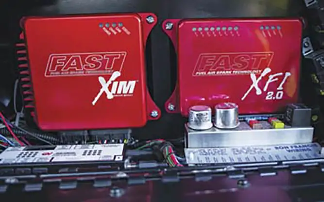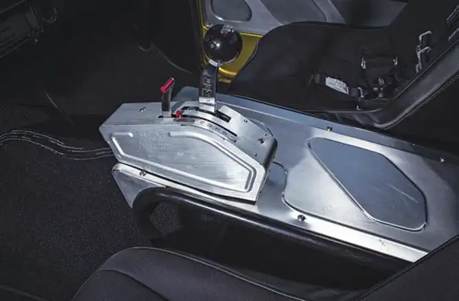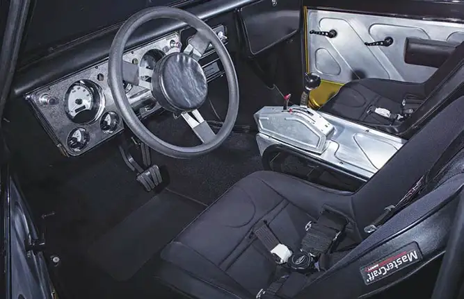 Next, Summit Racing accessories were bolted up to a Holley LS bracket kit. For air intake and fueling, a FAST intake manifold with 102mm Big Mouth throttle body with a custom Spectre Performance air intake was installed and saddled with FAST fuel rails leading to a Holley fuel pump and No Limit fuel cell. To expel exhaust gas during high revving sessions, a set of long-tube Gibson LS headers were ceramic-coated gold and installed to a custom exhaust system featuring twin Black Widow 180 series mufflers. A Flex-a-Lite LS radiator and electric cooling fans are used to cool off on hot days. In order to power the modern engine and accessories, the FAST XFI and XIM modules were mounted in the glove box using Ironworks Speed & Kustoms brackets along with the Gear Vendors over/underdrive controller with a Ron Francis Bare Bonz wiring kit powered by a Kinetik HC1800 pro battery. A billet GT-40-style switch panel from Ironworks controls the functions of the engine and accessories next to a set of Dakota Digital VHX gauges and a removable steering wheel. A B&M Racing TH400 automatic with a TCI 2400 convertor and a Gear Vendors over/underdrive transfers power from the engine. The Gear Vendors unit allows the gears to be split and provides more driver control during racing.